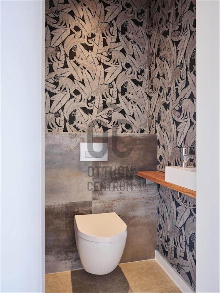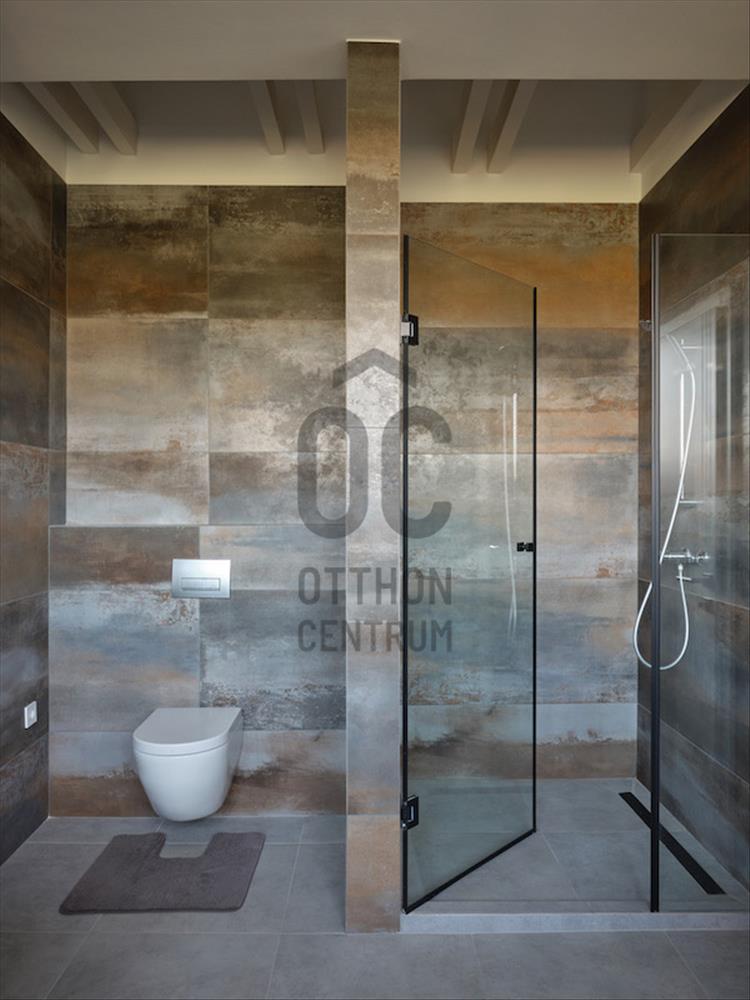 A nappali térből nyílik a vendég mosdó, valamint a két külön bejáratú, nagy méretű hálószoba, közöttük extra méretű, egyedi mintázatú falburkolattal rendelkező fürdőszoba, ahol dupla mosdó, kád és épített zuhany is megtalálható.