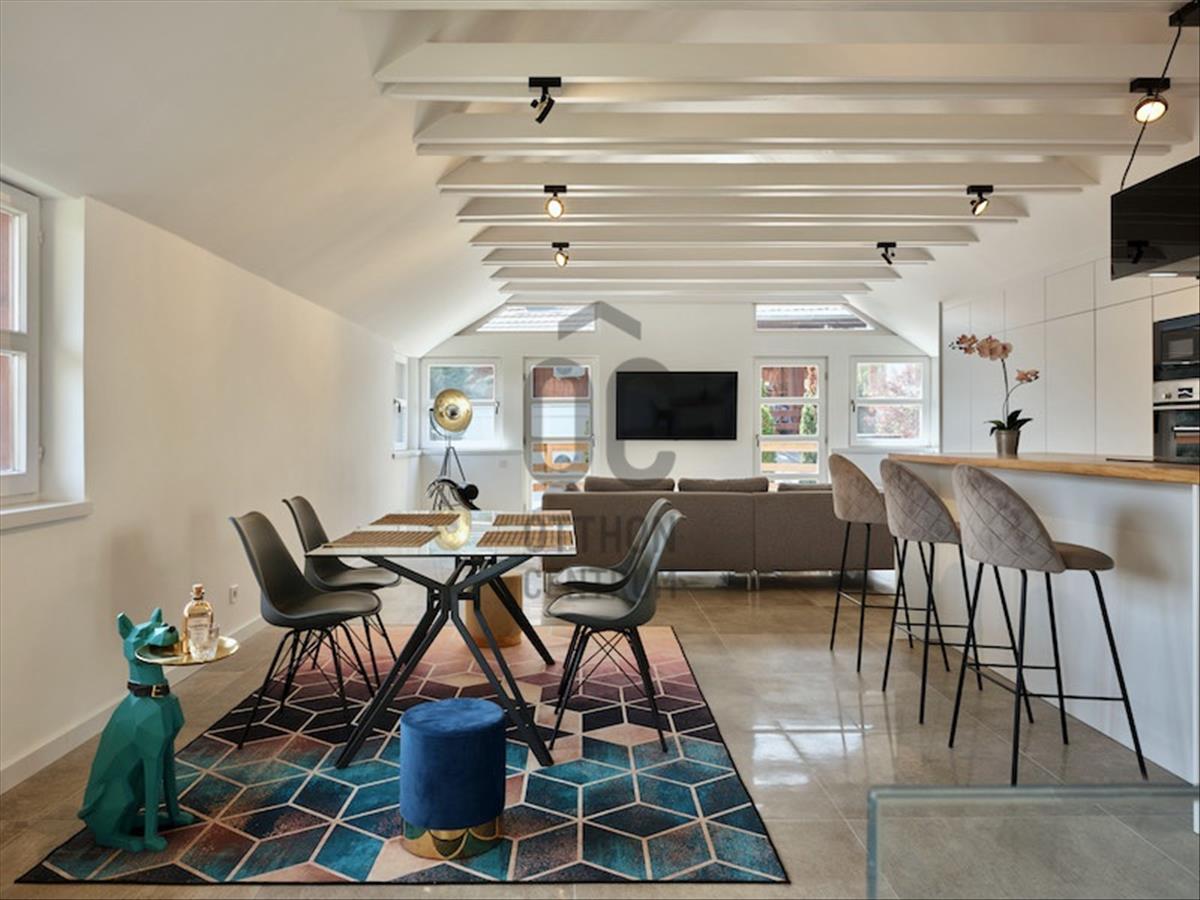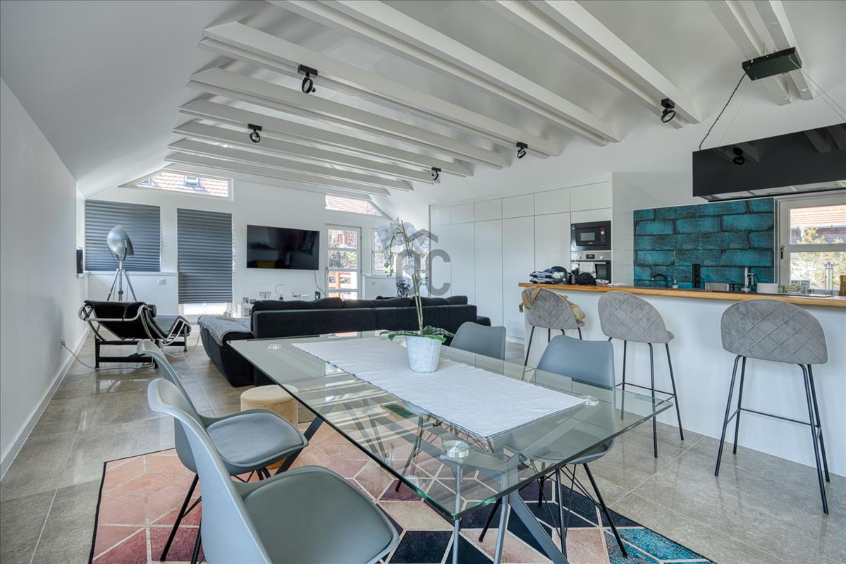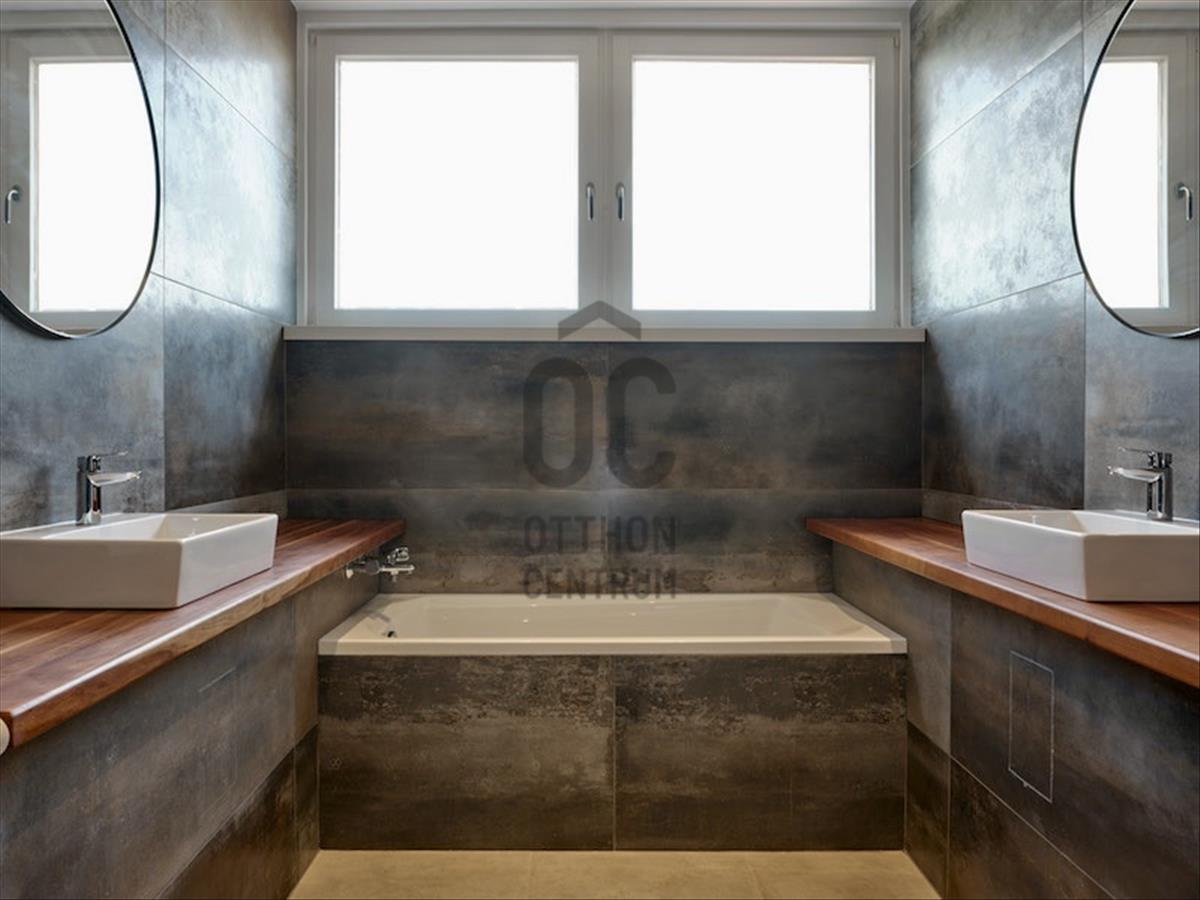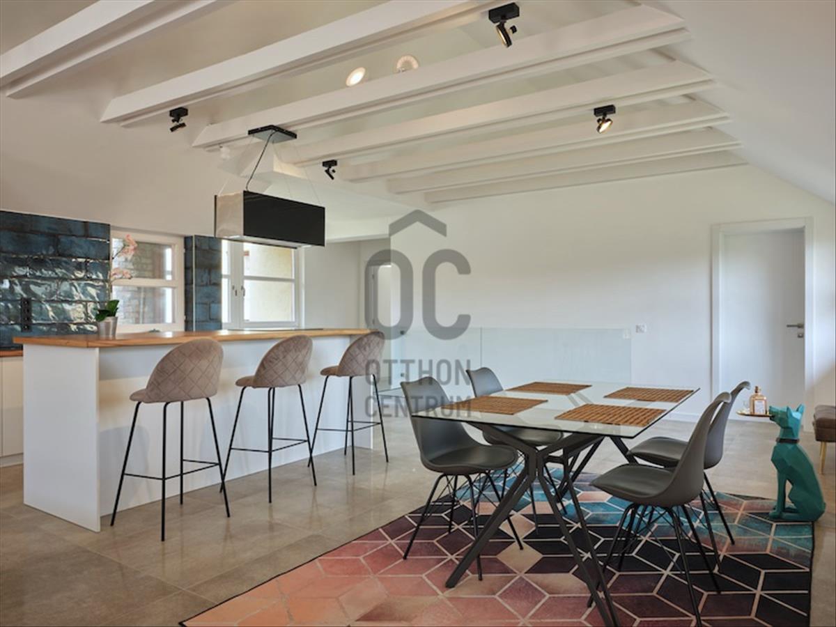 III. Róka-hegy, Csillaghegy felőli oldalában, 2 lakásos házban, első emeleti, a, luxus szinten - loft stílusban -, felújított, különleges hangulatú, 127 nm alapterületű, nappali + 2 hálószobás lakás, nagy méretű terasszal, gépkocsi beállóval eladó!A lakás bejárata közvetlenül a kertszintből tudunk felmenni az emeletre. a lépcső tömörfával burkolt és oldalfalba süllyesztett led világítással is rendelkezik. . a nappali – étkező – konyha egy légtérben került kialakításra.