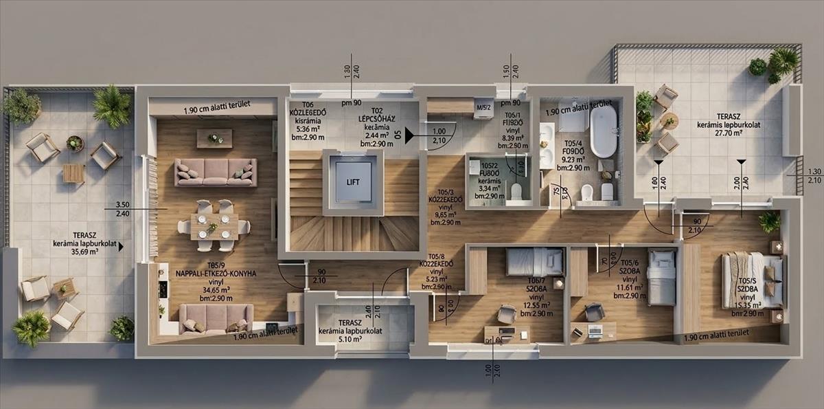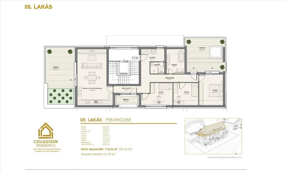 5, Lakás: Nappali+ 3 hálószoba, nettó 99nm , bruttó 112nm , 68nm terasz, délnyugati fekvés, duplakomfort.