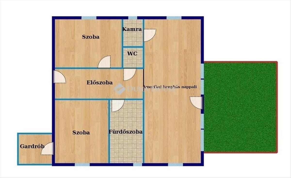 Az ingatlanban 2 hálószoba (az egyikhez gardrób is tartozik), egy amerikai konyhás nappali, egy fürdőszoba, egy külön mellékhelység, valamint egy kamra is található. Tartozik még hozzá egy 34, 5 négyzetméteres terasz, illetve egy 200 négyzetméteres kert is.