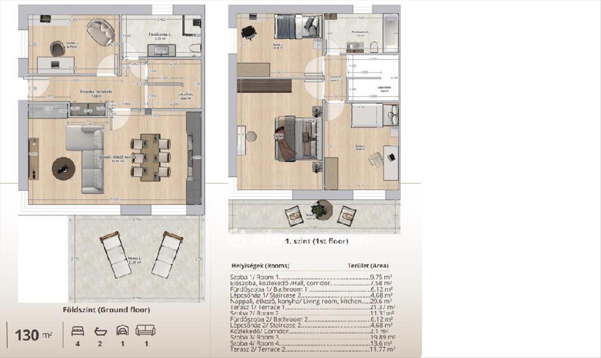 Az ingatlanok lakóegységenként 111 m2-es lakótérrel és hozzá tartozó 21 m2-es terasszal és 12 nm erkéllyel rendelkeznek.
