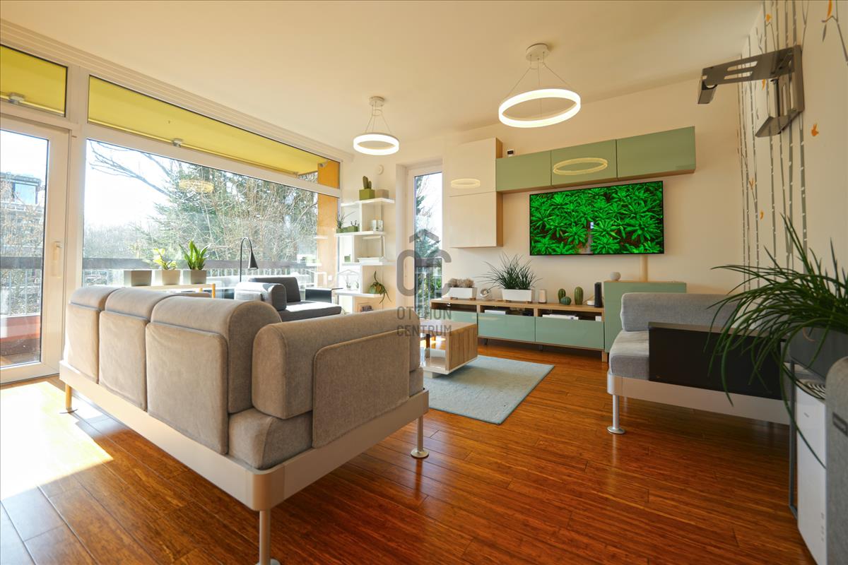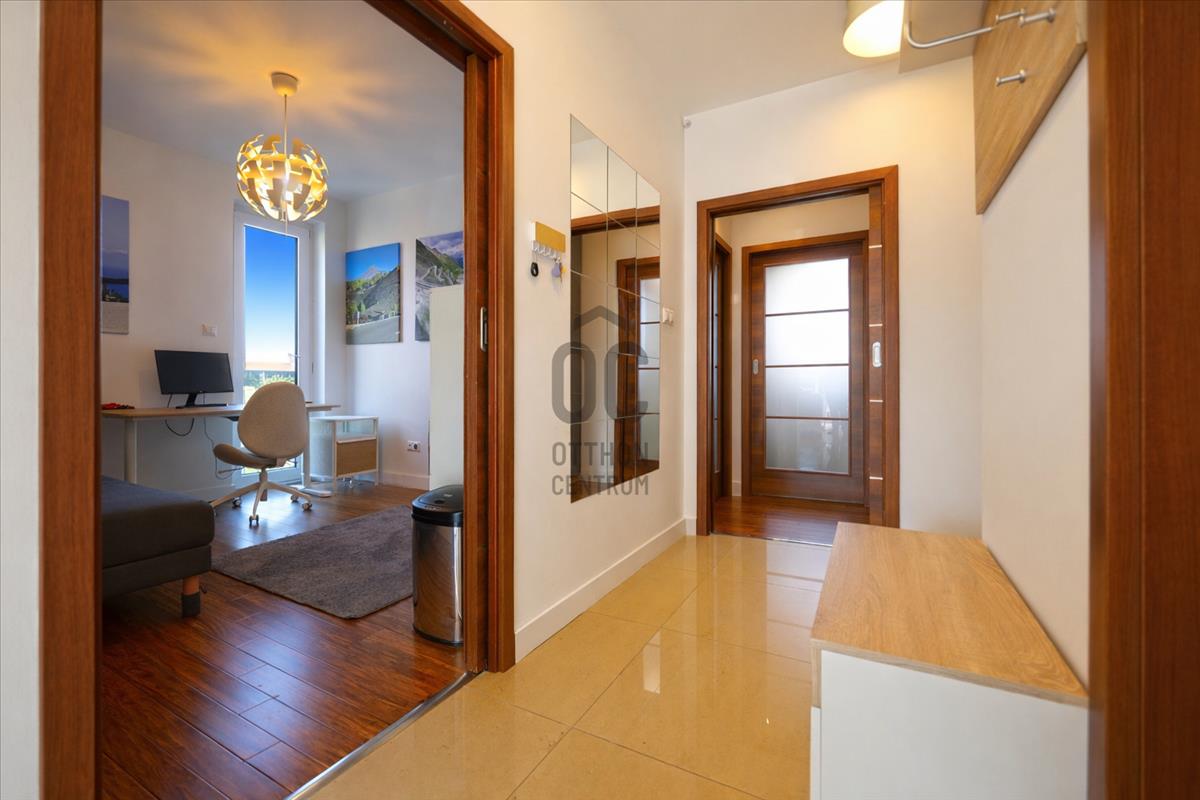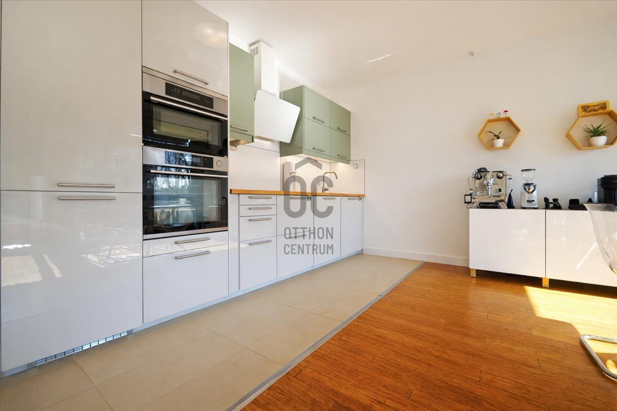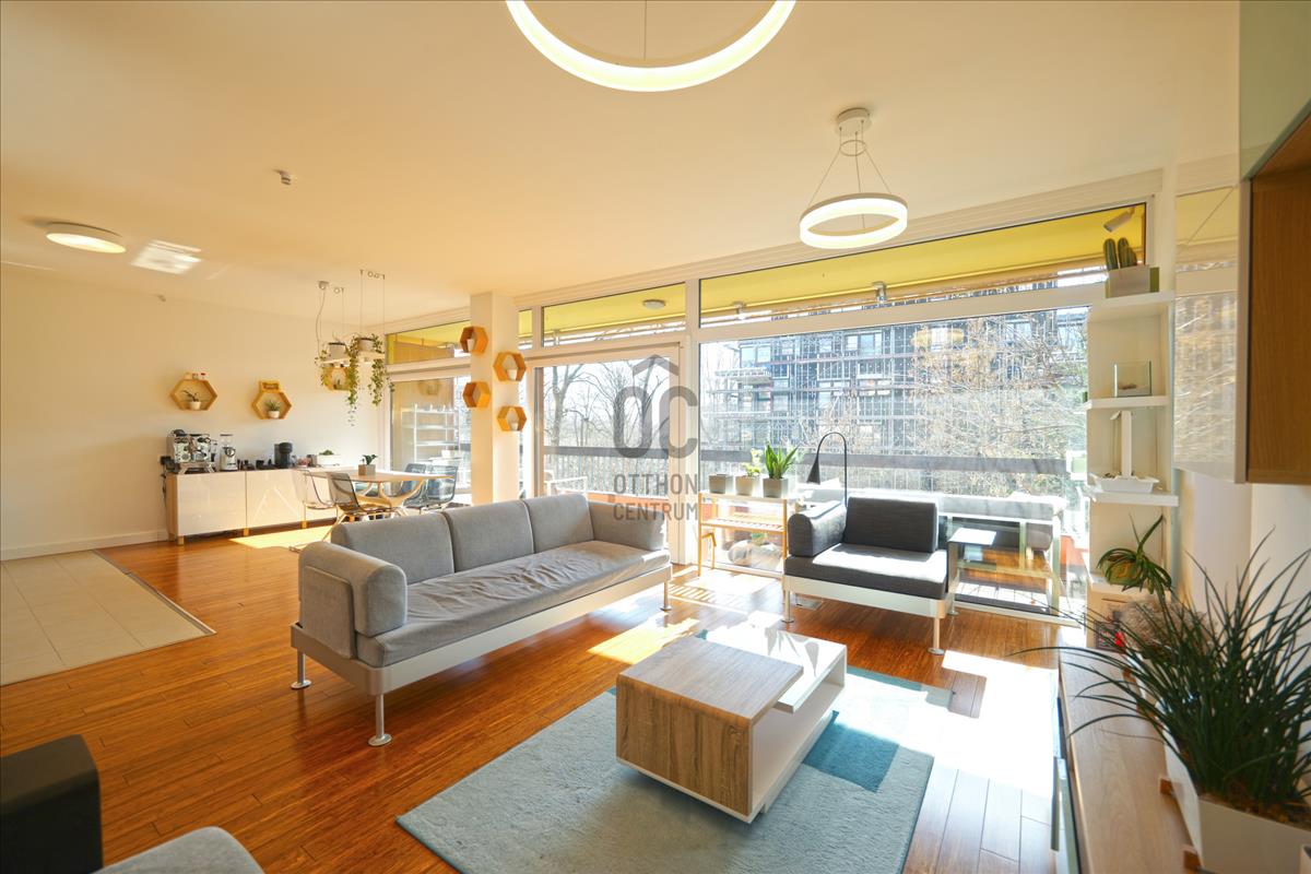 A 75 m²-es, első emeleti lakás egyik legnagyobb értéke a teljes üvegfalas nappali, amely a 10 m²-es teraszra nyílik, így az otthon egész nap természetes fényben úszik. a lakás csendes, zöld kertre néz.