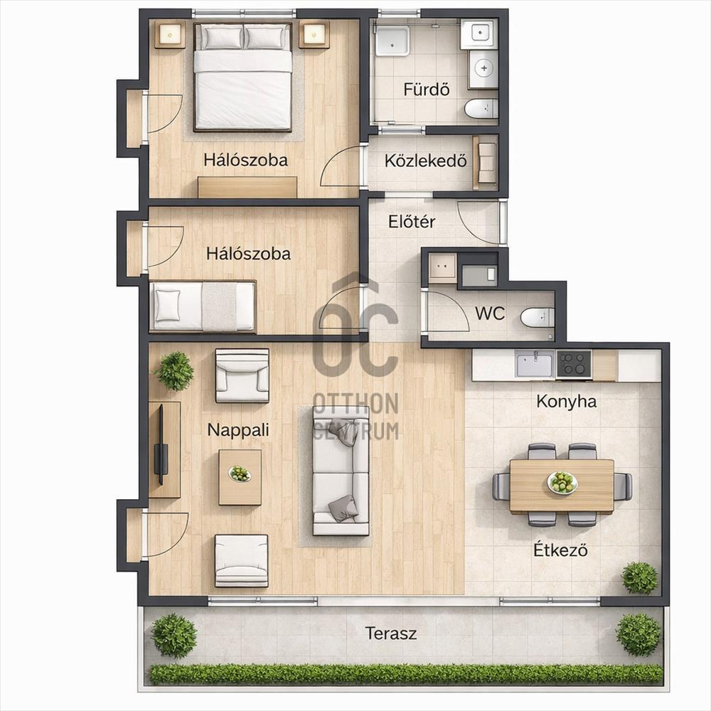 - Amerikai konyhás nappali + 2 hálószoba