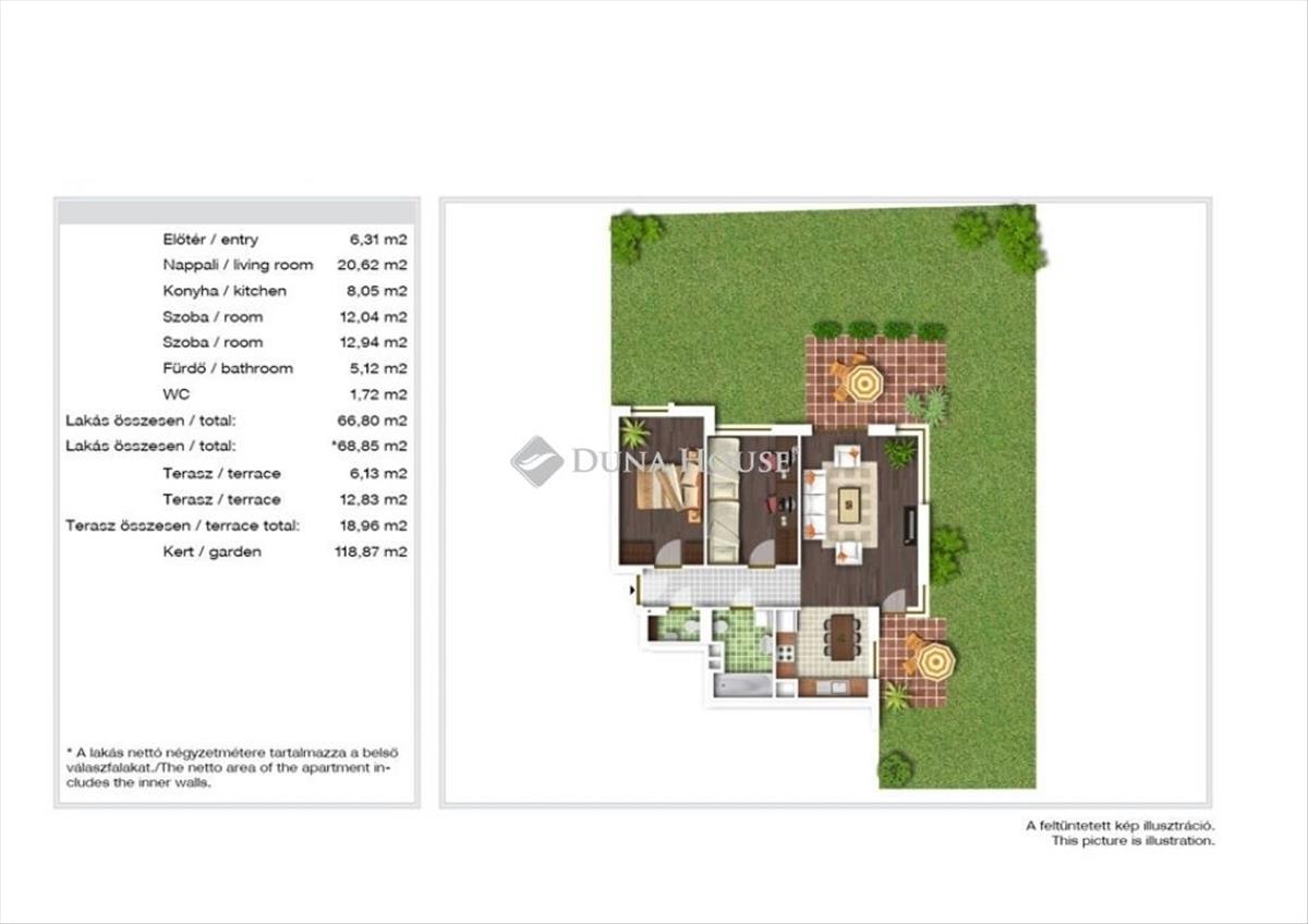 A lakóterület 67 m2 + 19 m2 terasz + 119m2 kizárólagos használatú kert!