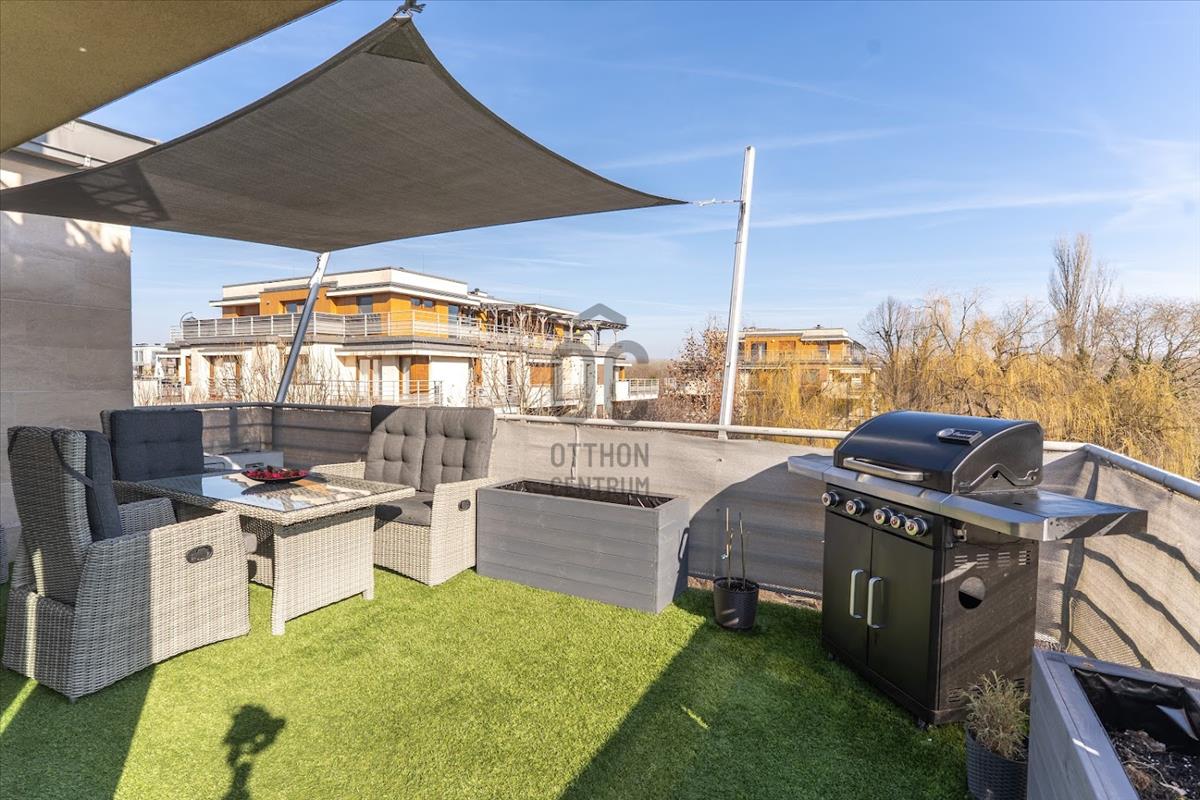 A 25, 7 négyzetméteres teraszról gyönyörű panorámában gyönyörködhetsz, a folyóra néző kilátás pedig minden reggel új inspirációt ad.