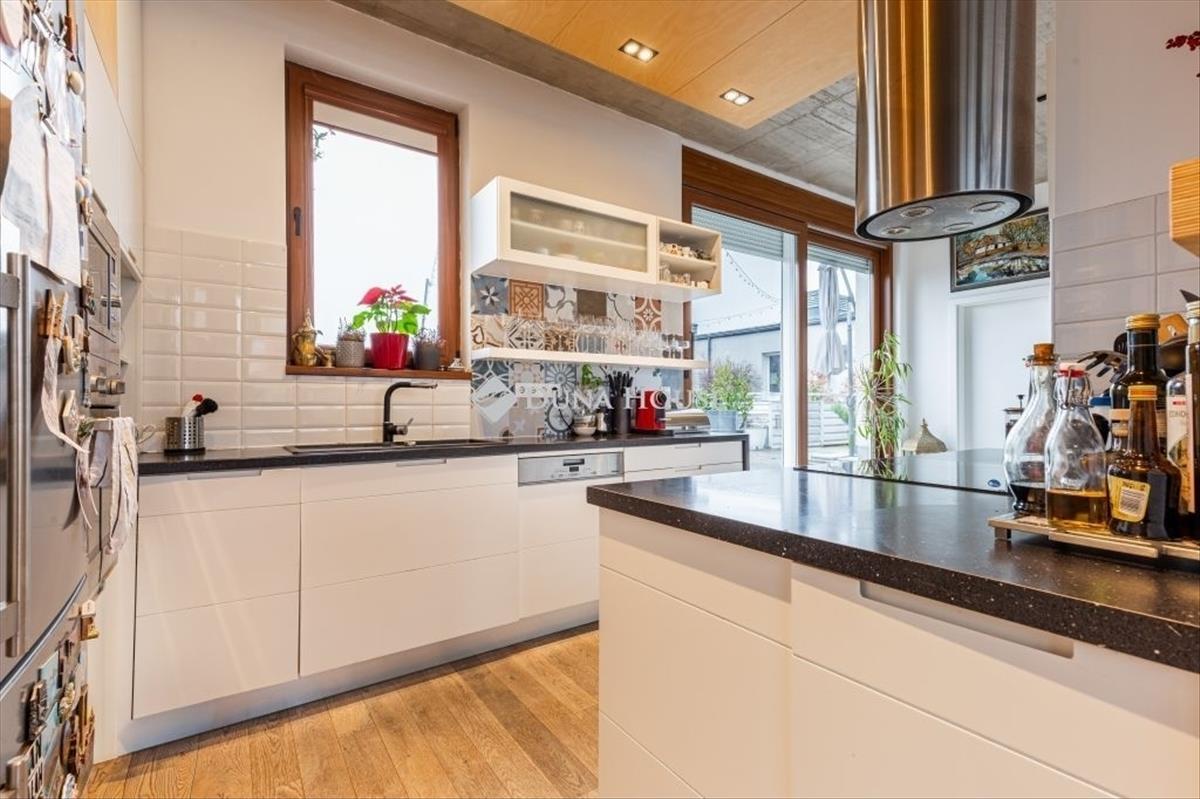 A belső tereket a 3 méteres belmagasság, a nagyméretű üvegfelületek, az amerikai konyhás nappali és a modern, mégis otthonos dizájn teszik igazán különlegessé.