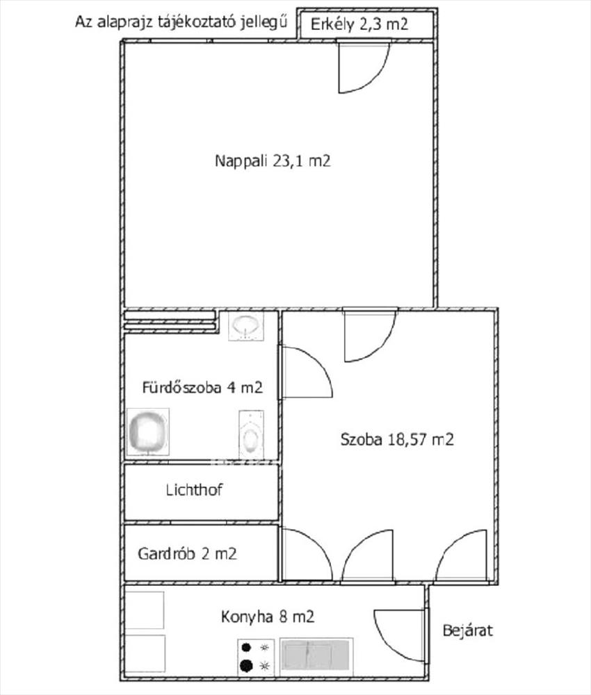 HELYISÉGEI: Nappali 23, 1 m2, szoba 18, 57 m2, konyha 8 m2, sarokkádas fürdőszoba 4 m2, gardrób/kamra 2 m2, valamint az erkély 2, 3 m2-es.