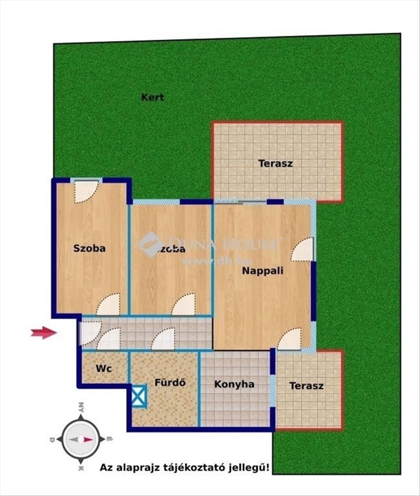 A lakóterület 67 m2 + 19 m2 terasz + 119m2 kizárólagos használatú kert! Jó beosztású lakás: előszoba, amerikai konyhás nappali, 2 hálószoba, fürdőszoba WC-vel, külön wc, teraszok, a lakást körbeölelő saját kert.