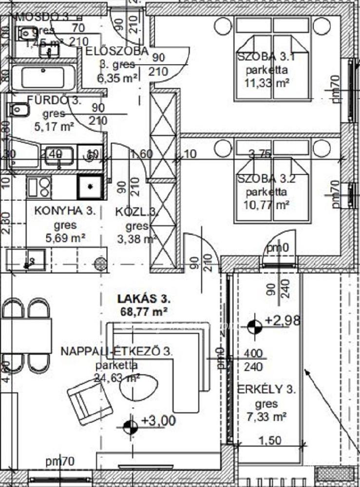 Emeleti lakások, 68, 60 és 68, 37 nm nettó alapterülettel, 7 nm-es terasszal, 3 szobával rendelkeznek.