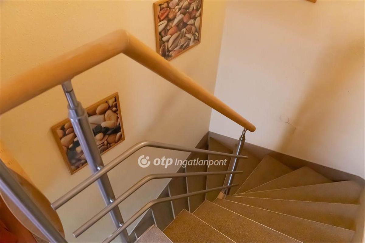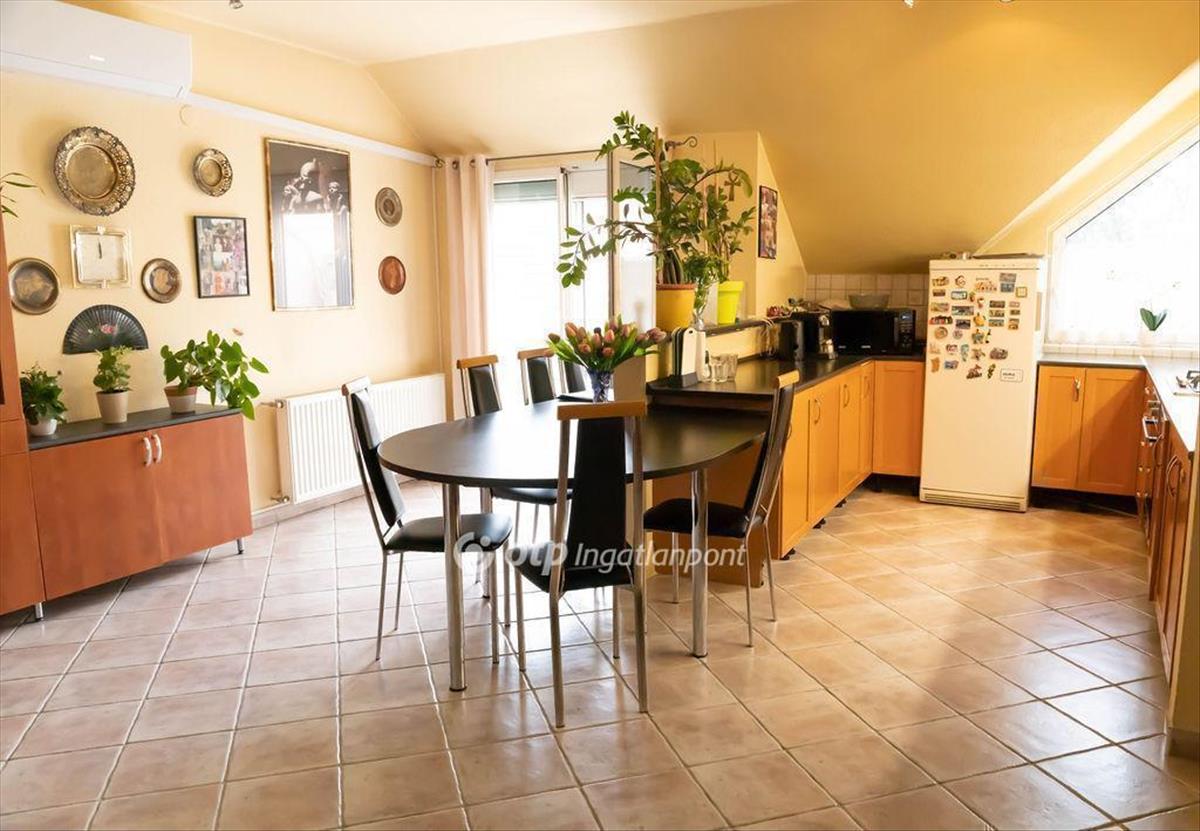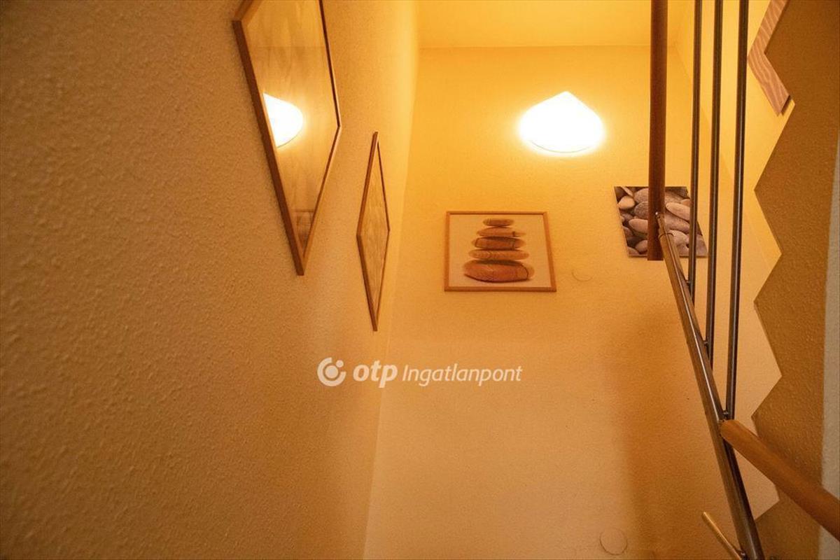 A biztonsági ajtón az alsó szintre belépve egy praktikus vendégfogadó előtérbe érkezünk, ahonnan egy mellékhelyiség is nyílik. Már a belépéskor elénk tárul és azonnal hívogat egy közel 29 m2-es, tágas, napfényes, amerikai étkezős, nagy ablakos konyha, ami ikea bútorral, impozáns, íves nagy asztallal, minden modern konyhai géppel felszerelt. Innen egy dupla üvegajtón át jutunk a 6, 45 m2-es dél-nyugati fekvésü erkélyre, ahol a belső ősfás, zárt udvarra nézve iszogathatjuk reggeli kávénkat. a meleg föld színek, a jó tervezői munkát dícsérő fekvés és a tulajdonos kiváló ízlése valódi nagypolgári életérzést kölcsönöz az ingatlannak. Az étkező egyik oldalán egy 27 m2-es nappali, a másik oldalon egy 14 m2-es szoba, 10 m2-es fürdőszoba, egy kis kamra és az alsó szintről dupla belmagasságra nyiló lépcső feljárata található, amelyen át könnyedén feljutunk a felső szintre. Az emeleten egy barátságos nappali fogad, amiből nyílik egy nagy zuhanyzós, WC-s fürdő, és két irányba egy 12 ill. Egy 19 m2-es szoba redőnyökkel, szúnyoghálóval szerelt tetőtéri ablakokkal.