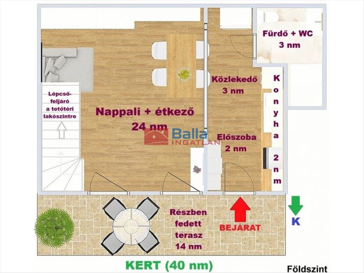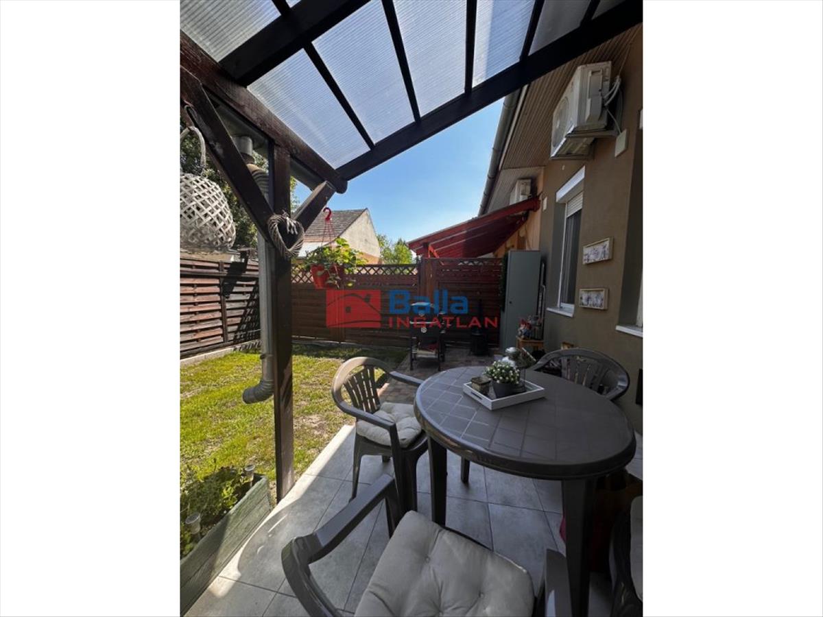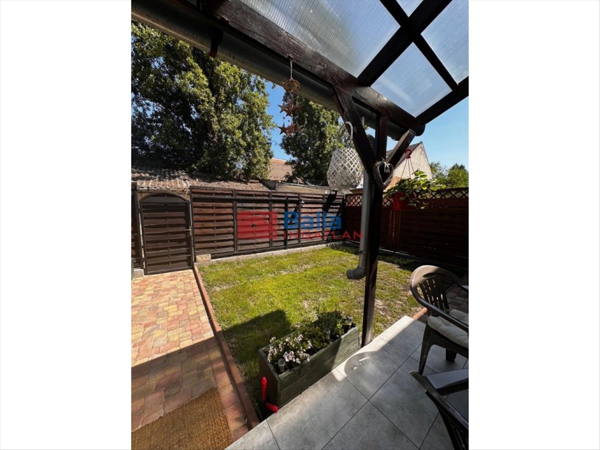 Saját lekerített kert (kb 50 m2), melynek része a 14 m2-es fedett terasz. a lakáshoz tartozik még egy 8 m2-es tároló.