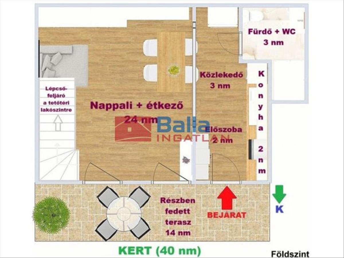Saját lekerített kert (kb 50 m2), melynek része a 14 m2-es fedett terasz. a lakáshoz tartozik még egy 8 m2-es tároló.