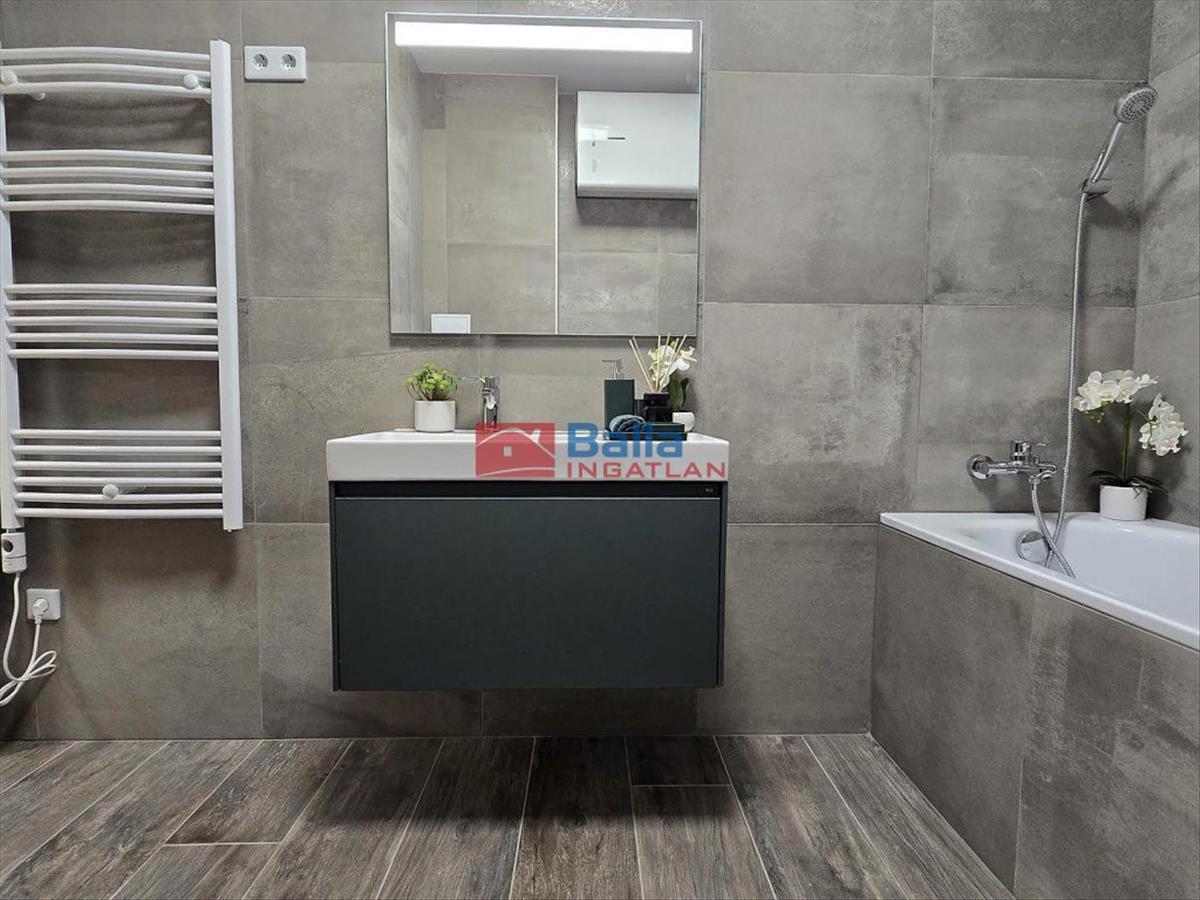 A fürdőszoba és a különálló Wc letisztult, minőségi anyagokkal készült. Roca és Laufen szaniterek, Grohe csaptelepek, Roca Led világításos tükör és új Ariston villanybojler került beépítésre – minden új, minden egységes.