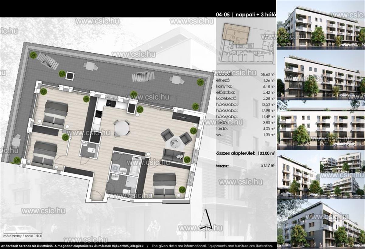 A lakás a társasház 4. emeletén helyezkedik el, É-K-i tájolású: 103 nm es n+3 szobás.