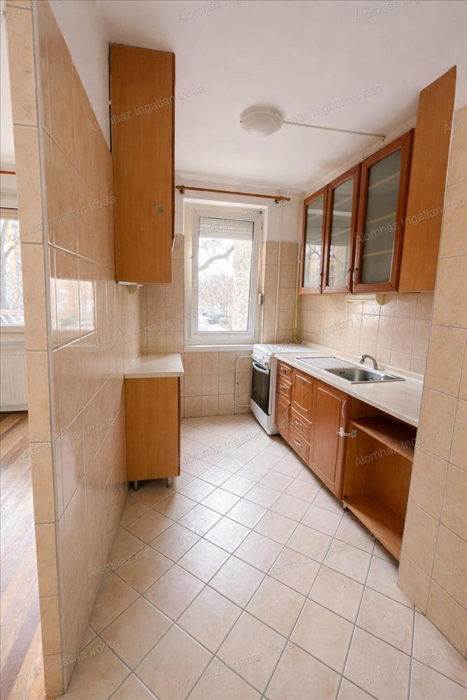 pedig kellemes, napfényes lakóteret biztosít a délutáni órákban. A konyha ablakos, így természetes fénnyel és szellőzéssel rendelkezik.