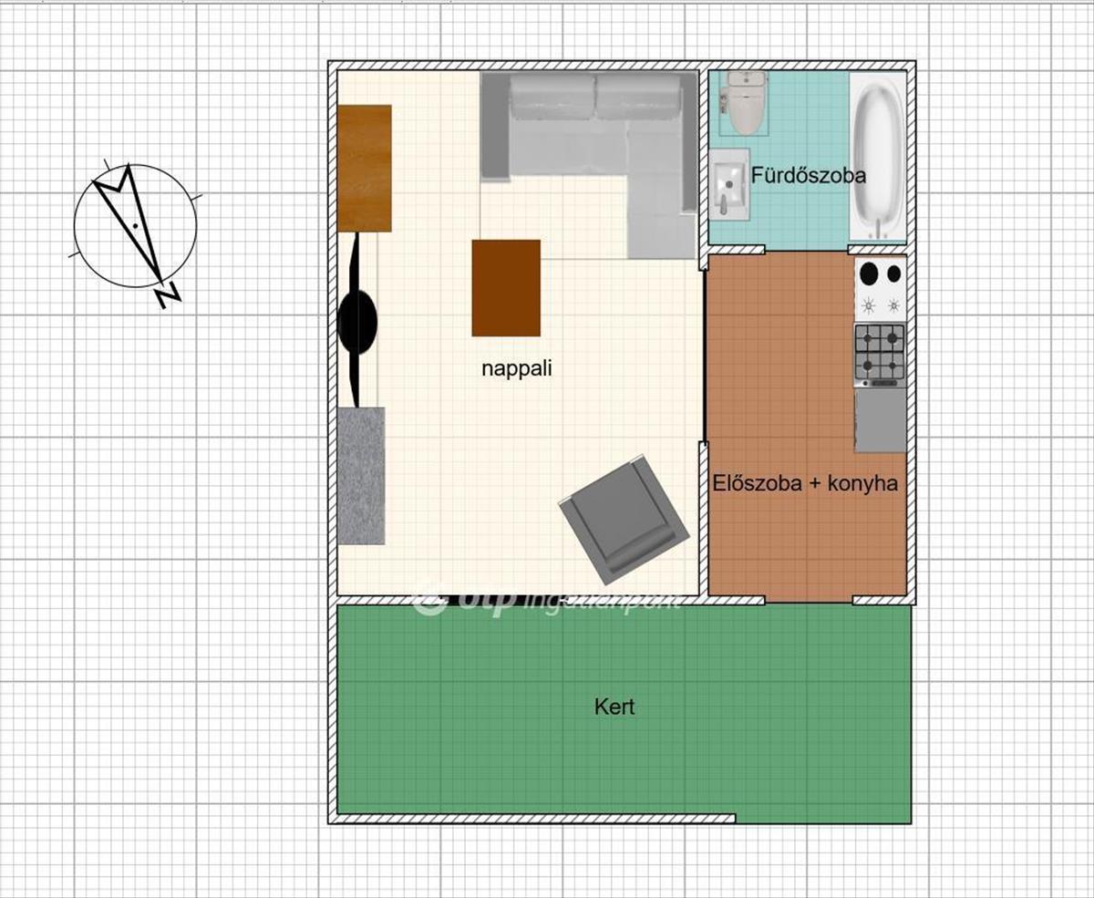 A lakás 19 m2 területtel rendelkezik, ehhez társul egy saját kert.