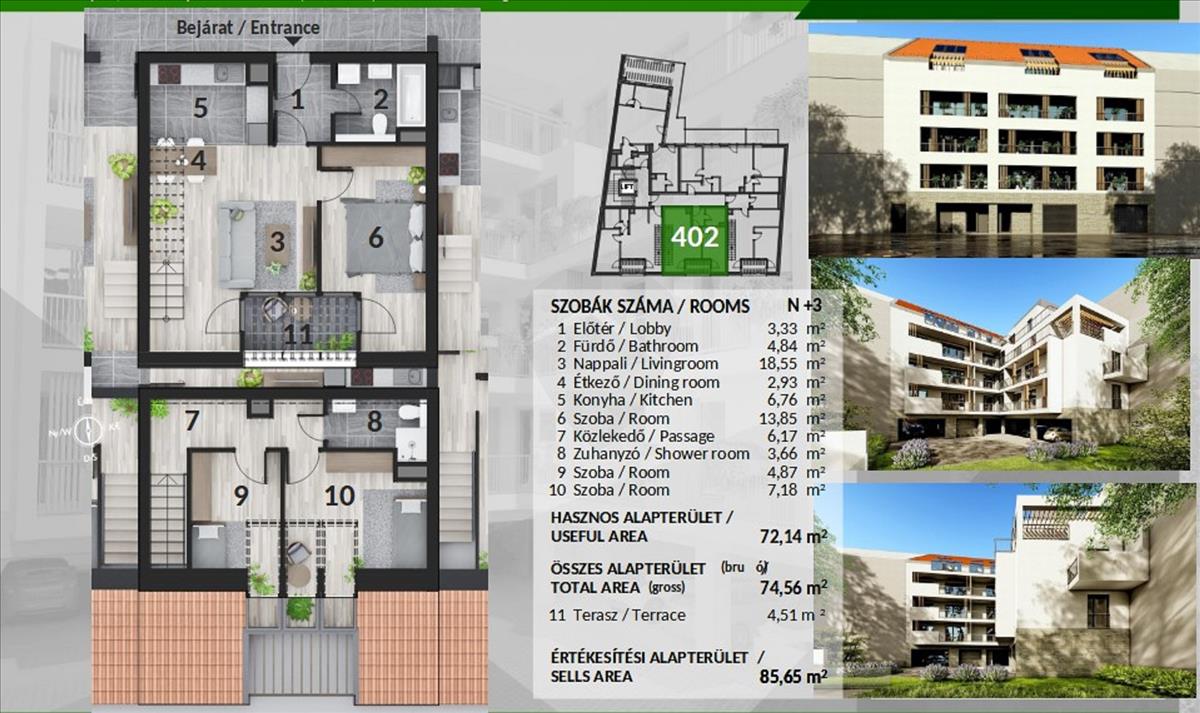 Az ingatlan alapterülete 84nm , amely négy tágas szobát rejt, a belső 2 szinten elosztva, így bőséges teret biztosít a mindennapi élethez. Az alsó, és felső szinten is található fürdőszoba egyedi tervezésű, és a világos amerikai konyhás nappali tökéletes helyszín a családi összejövetelekhez vagy baráti találkozókhoz.