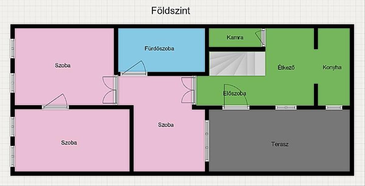 A földszinten 3 szoba, fürdőszoba, konyha, tágas étkező és kamra található.
