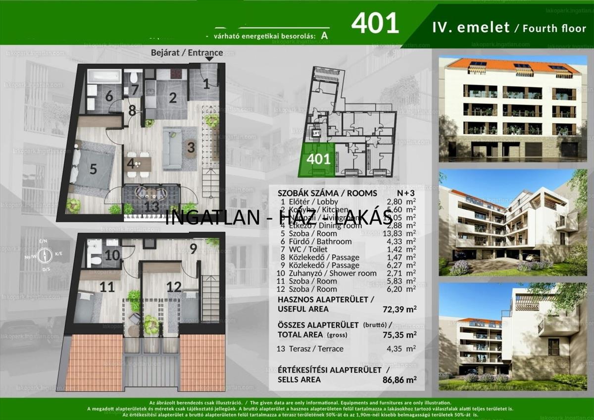 A401-es lakás típus: belső kétszintes felső szint beépítési lehetőséggel, nappali+3 hálószobás, külön fürdővel és Wc-vel, amerikai konyhával és egy közel 5nm-es loggiával, mely az utcára néz