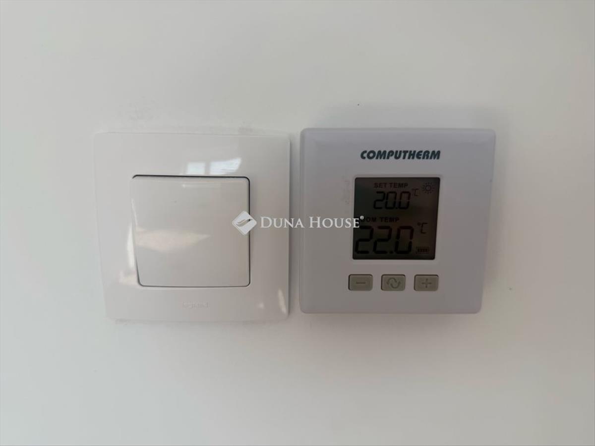 A lakás napelemes és hőszivattyús padlófűtéssel rendelkezik, elektromos redőny előkészítéssel. Kádas fürdőszoba, wc külön helyiségben, kézmosóval. Szobákban és nappaliban termosztát, a nappaliban klíma.