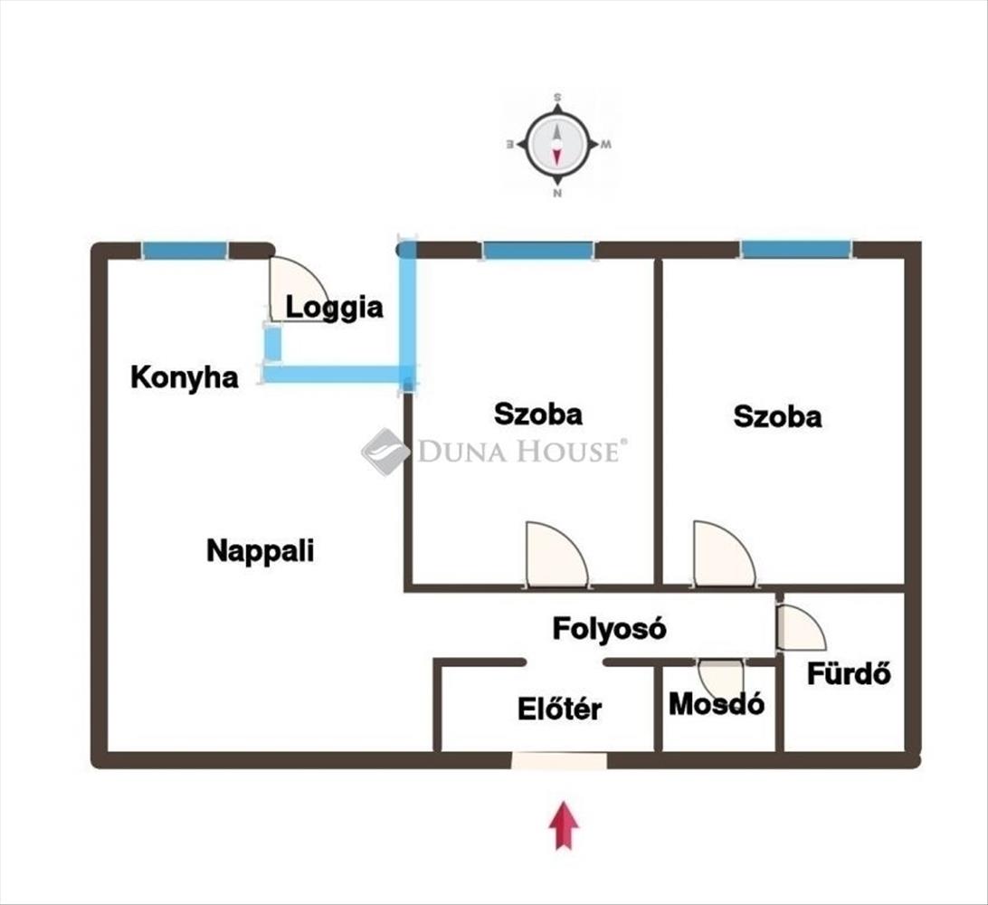 A lakás elrendezése amerikai konyhás nappali plusz 2 különnyíló hálószoba. a 4 m2-es napfényes lodzsa a nappaliból és az egyik hálóból is megközelíthető.