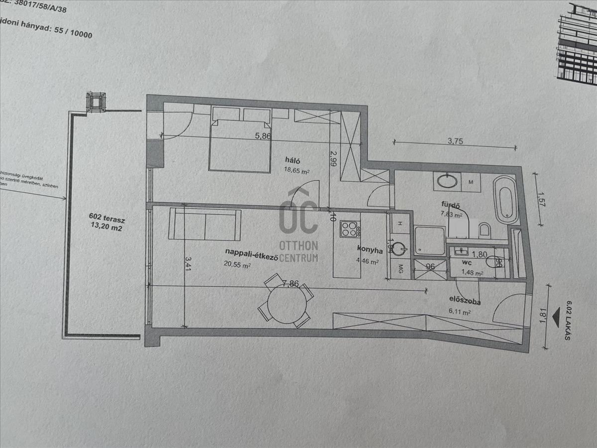 A tulajdoni lapon 57m2, a valóságban 59, 08 m2 alapterületű.