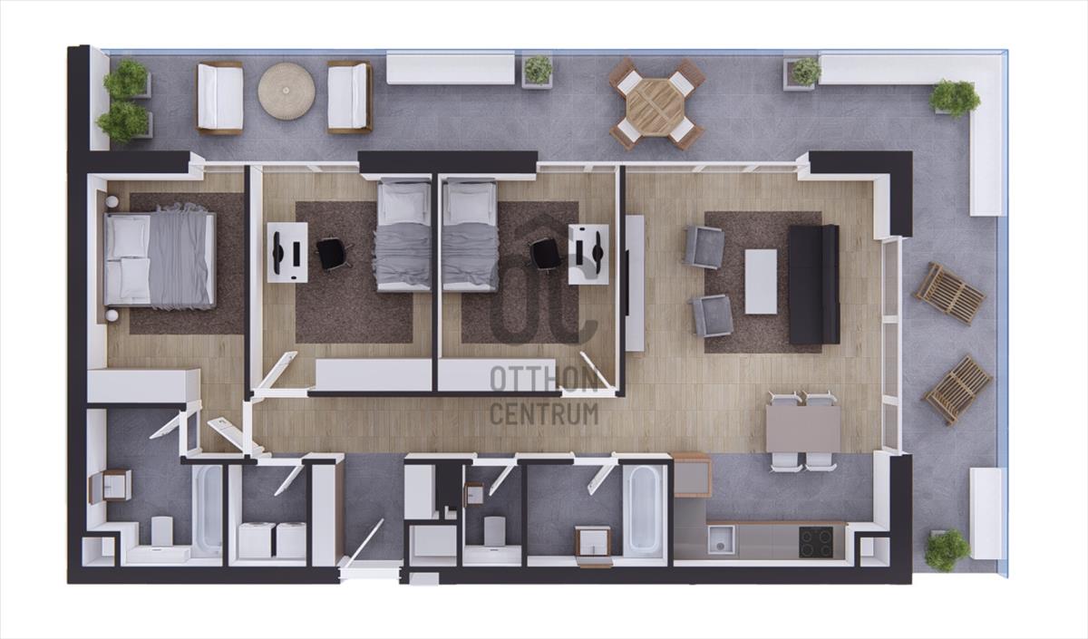 Budapest IX. kerületében, a Metrodom Green lakóparkban eladó egy kiváló elosztású, nappali + 3 hálószobás, sarokteraszos otthon, amely csendes, zöld belső kertre néz, délnyugati tájolású, világos és élhető.