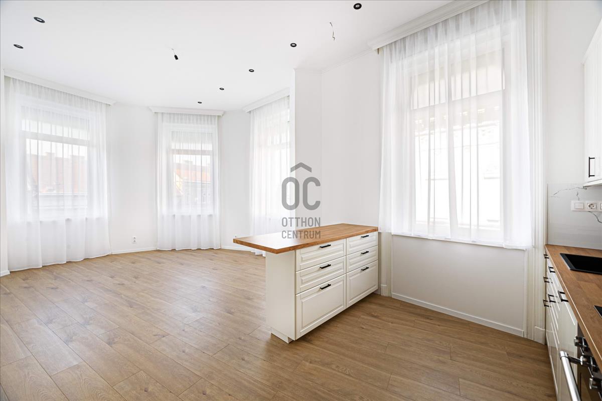 Ez a 83 m²-es, negyedik emeleti, teljes körűen felújított nagypolgári lakás a klasszikus pesti eleganciát ötvözi a modern technikai megoldásokkal és a mai kor kényelmével. a 2 tágas hálószoba, a közel 5 m²-es fürdő, külön mosdó és a közel 26 m²-es amerikai konyhás nappali ideális elrendezést biztosít akár család, akár életkezdő fiatal párok számára. a 330 cm-es belmagasság és a nagy ablakfelületek világos, levegős tereket teremtenek, a lakás pedig utcai nézetű, ablakai a Ferenc körútra és a Tűzoltó utcára néznek.