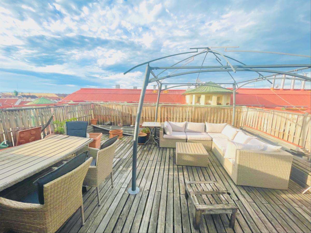 Budapest IX. kerületének szívében, egy csendes, zölddel szegélyezett, sétáló jellegű, csökkentett forgalmú utcában kínálunk megvételre egy páratlan hangulatú, bruttó 142 m²-es kétszintes művészlakást – saját 40 m²-es intim tetőterasszal, lenyűgöző kilátással a belvárosra és a Budai-hegyekre.