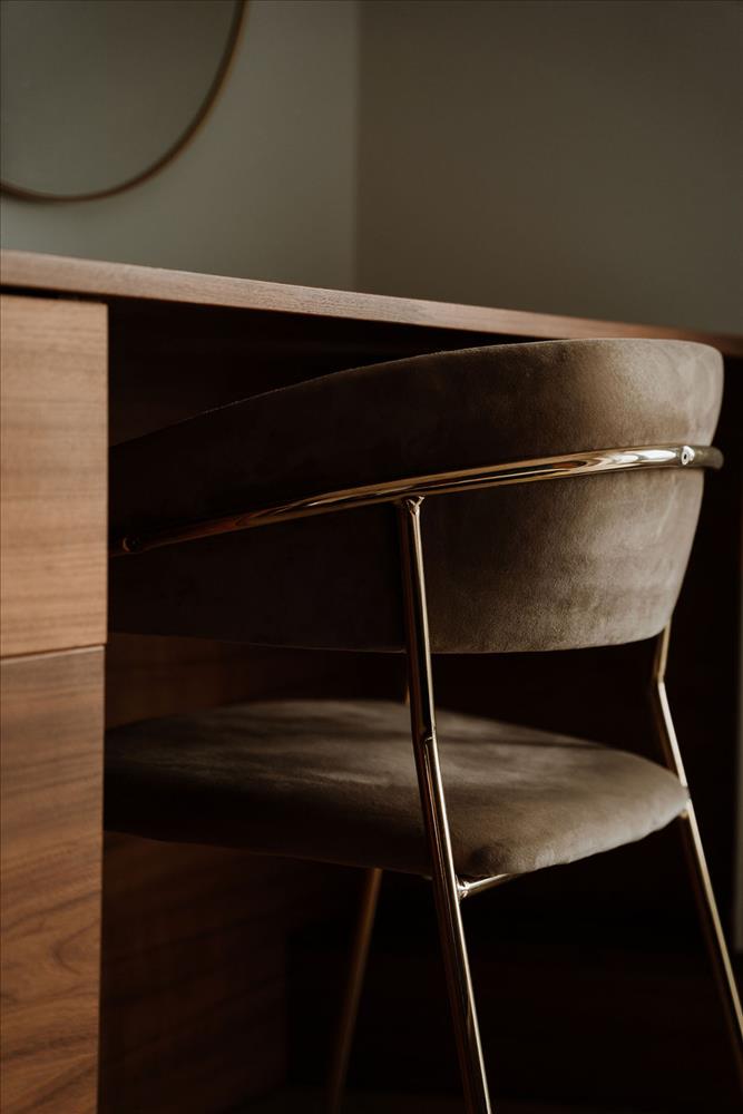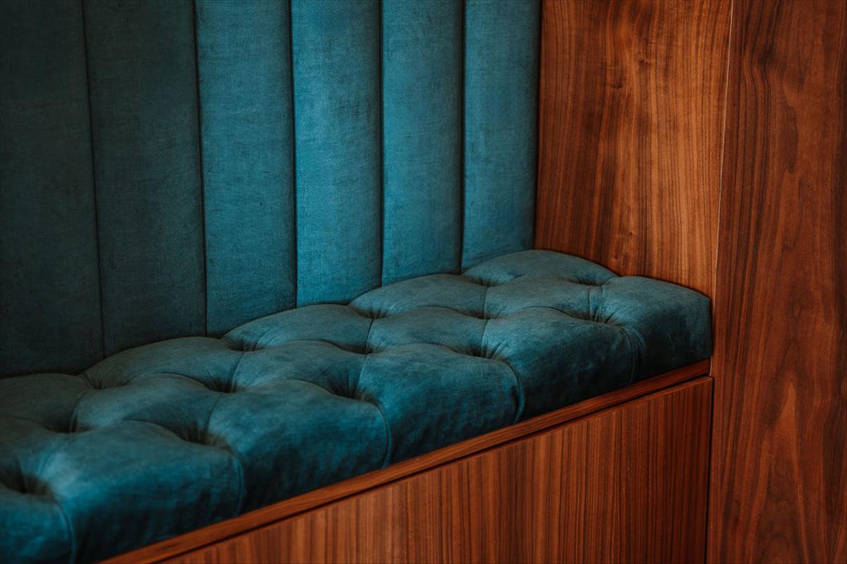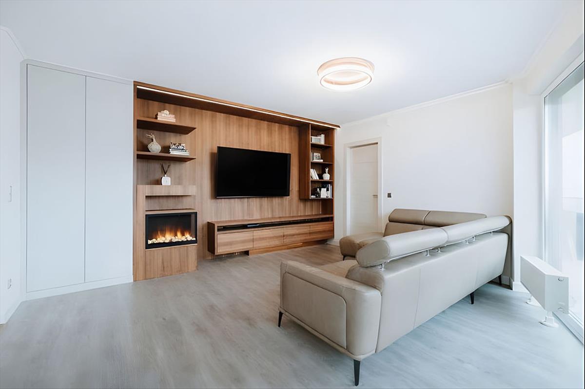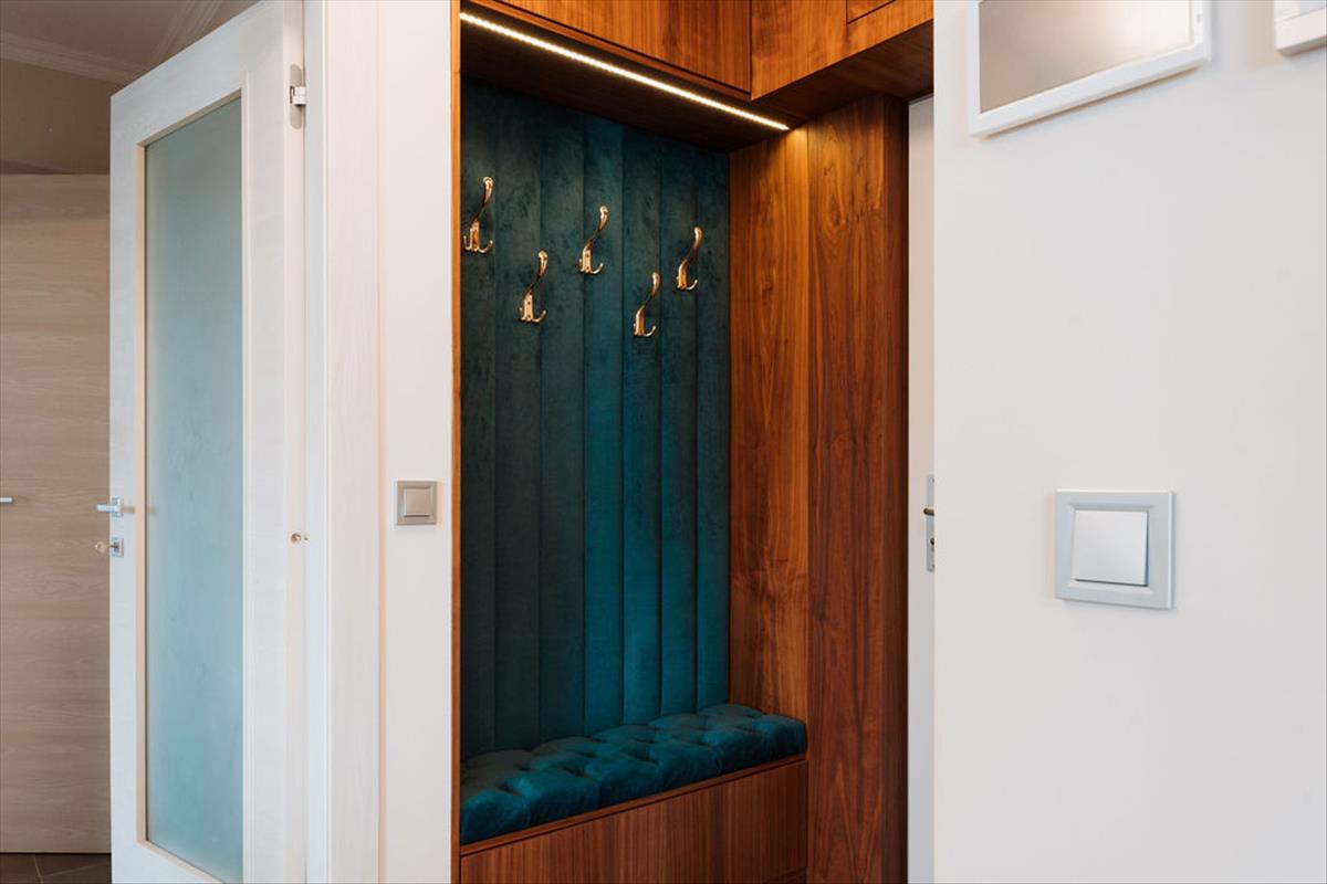 * **Egyedi tervezésű, dió furnéros beépített bútorok**
