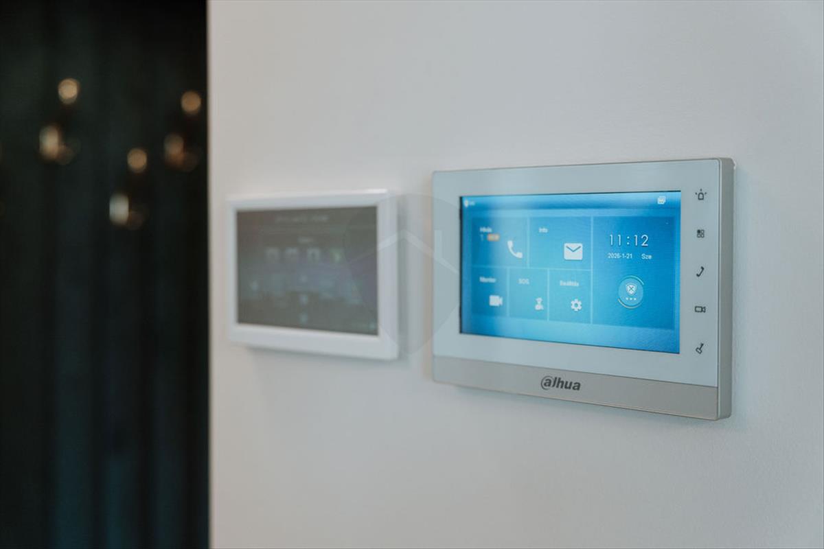 * **Riasztórendszer**: nyitásérzékelők minden nyílászárón, mozgásérzékelők minden helyiségben, **füstérzékelő** a konyhában