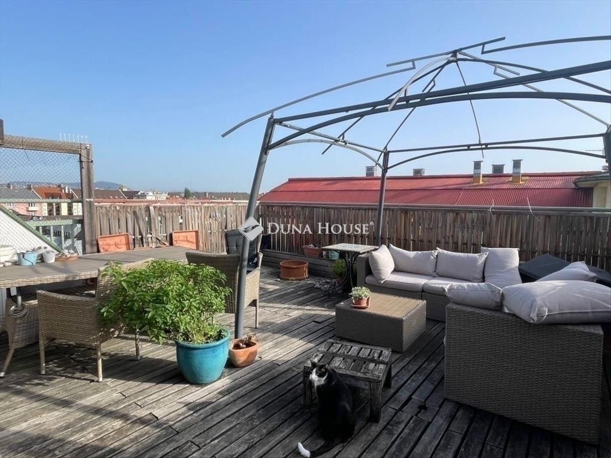 Budai kilátás, pesti élet, panorámás tetőterasz a város felett! Ferenc tér környéki művész lakás: 40 m2 tetőteraszKét háló Tágas, fényes nappaliAmerikai konyha2000-es években épült hatemeletes társasházban található ez a belső kétszintes, napfényes lakás. Az ingatlan különlegessége a tetőterasznak köszönhető egyedülálló panoráma. a lenyűgöző kilátás mellett egy tágas és világos nappali biztosítja a családi és baráti összejövetelekhez a tökéletes helyszínt. Az amerikai konyhás nappaliból egy kényelmes és dizájnos lépcső vezett a felső szintre, ahol két hálószoba, gardróbbal és fürdővel várja az új tulajdonost. a tetőterasz nem csak pihenésre, vendégek fogadására, de akár kénylemes otthoni munkára is alkamas.Ez a lakás ideális választás azok számára, akik egy modern, tágas otthonra vágynak, amely könnyedén megközelíthető, ugyanakkor egy csendes oázis, ahová a nap végén visszatérhetnek. Ha a kényelmet, a stílust és a központi elhelyezkedést keresi, ez az ingatlan tökéletes Ön számára.