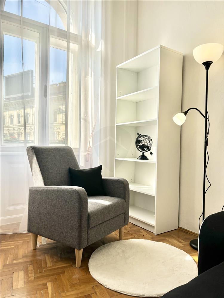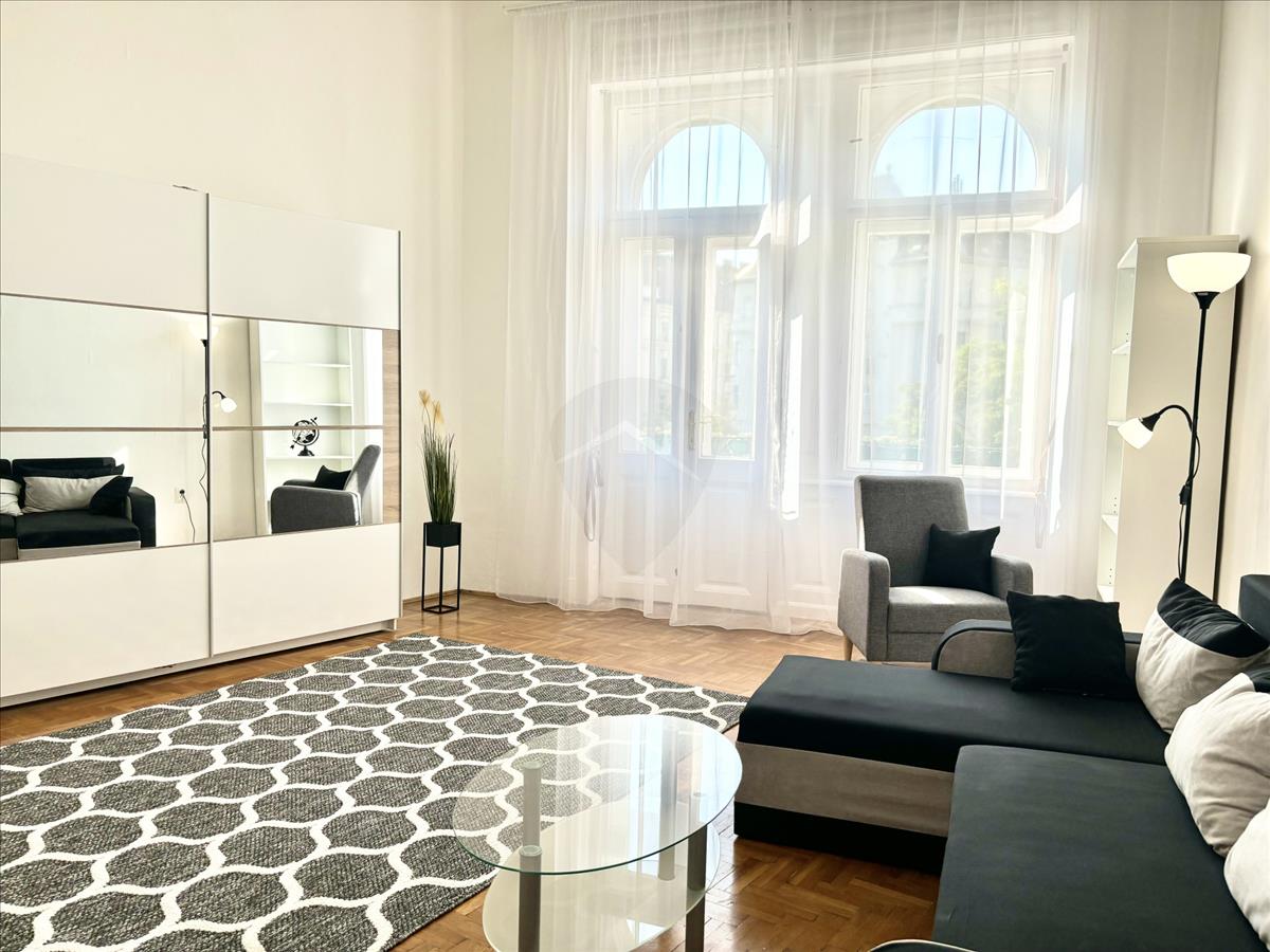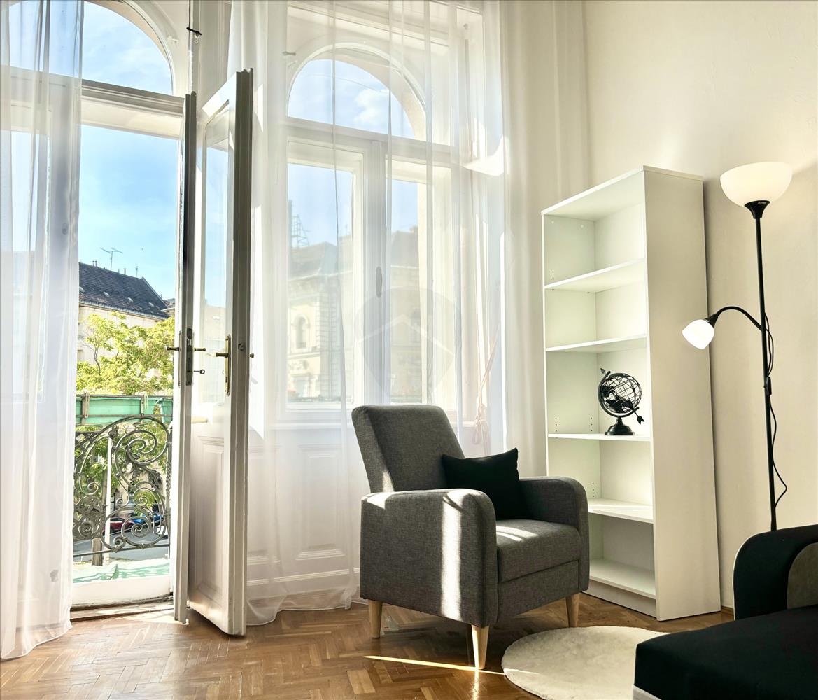 Eladó Erkélyes utcai nézetű egy szobás 45 nm -es lakás a Ferenc körúton, rálátással a Dunára.