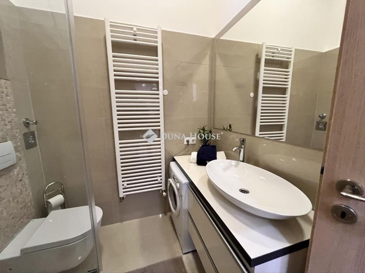 Különleges előnye a két fürdőszoba és a külön wc, amely ritkaságnak számít a környéken. a jelenlegi elrendezésben a nagyobb szoba egybenyitva a nappali-konyhával szolgálja a tágas közösségi tér igényét, ugyanakkor a válaszfal és az ajtó könnyedén visszaépíthető, így 2 hálószobás, 2 fürdőszobás + külön WC-s, nappali-konyhás lakás is kialakítható.