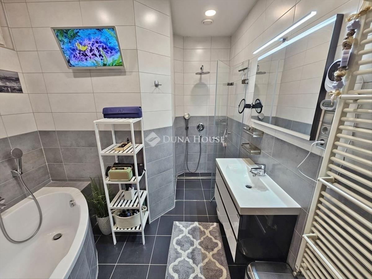 -fürdőszobában sarokkád és épített zuhanyzó (padlófűtéssel és tv csatlakozás)