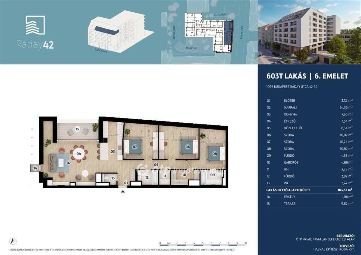 Budapest IX. kerületében, a Ráday utca 42. Szám alatt kínálunk eladásra egy nappali + 3 szobás, 103, 54 nm -es, 10, 62 nm terasszal rendelkező lakást, amely egy különleges fejlesztés része. Az épület egy meglévő struktúra újragondolásával, magas műszaki tartalommal és környezettudatos megoldásokkal születik újjá.