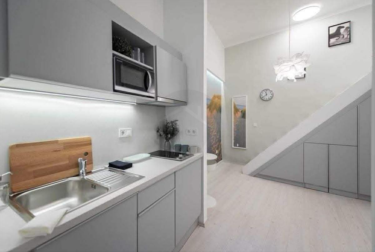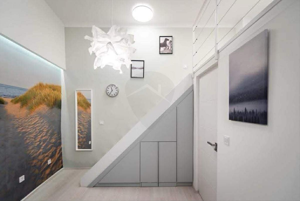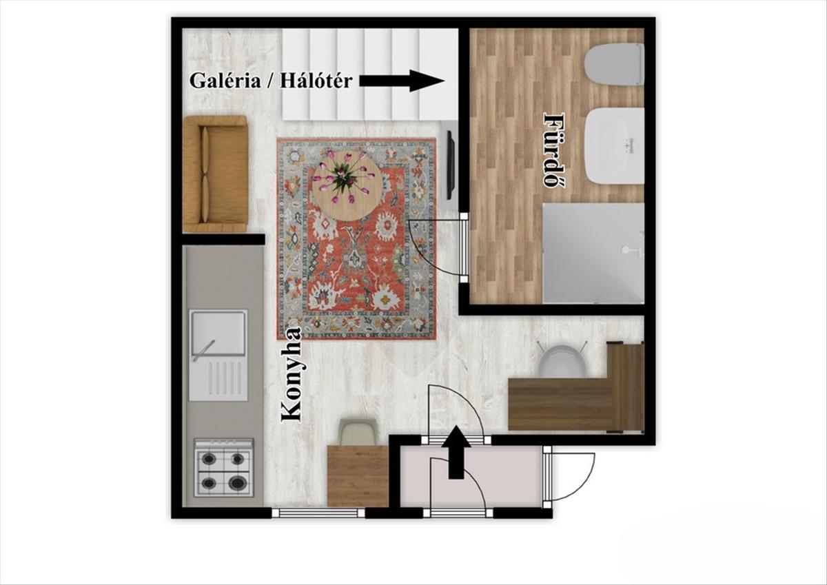Az okos és praktikus tér kialakításnak köszönhetően kényelmes életteret nyújt lakóinak. a beépített modern konyhabútor teljesen gépesített. a fürdőszoba is tágas, zuhanyzós, a fekvő galéria alatt kapott helyet, mint ahogy a gépészet és a háztartási eszközök/mosógép is. a lépcső alatt a beépített szekrény mögött találhatók így ezek nincsenek szem előtt.
