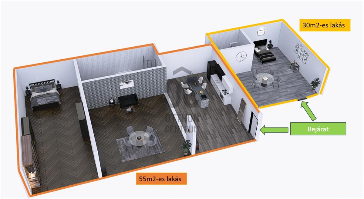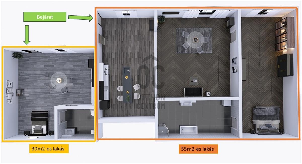 - 55m2-es lakás (2 szoba): amerikai konyhás nappali + hálószoba;