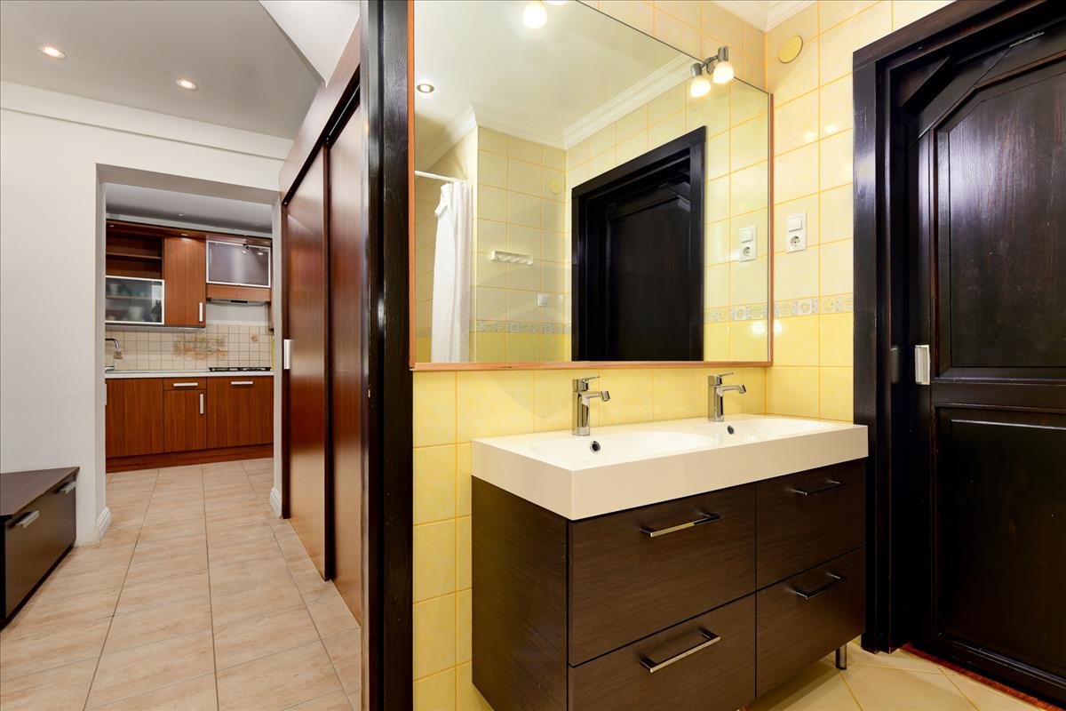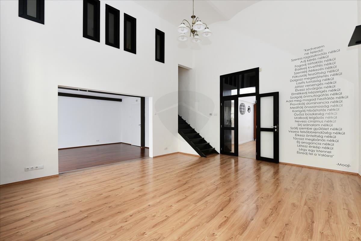 A lakásba belépve az előszobába érünk, ahol egy konyha rész is ki lett alakítva. Tovább haladva egy beépített szekrényekkel ellátott közlekedőn keresztül juthatunk el a fürdőszobába. a konyhán túl pedig a 2 egybe nyíló szoba van, ami hatalmas belmagassággal rendelkezik. a felső szint is ki lett alakítva és használva. Fent 2 szoba és egy tároló helyiség került kialakításra.