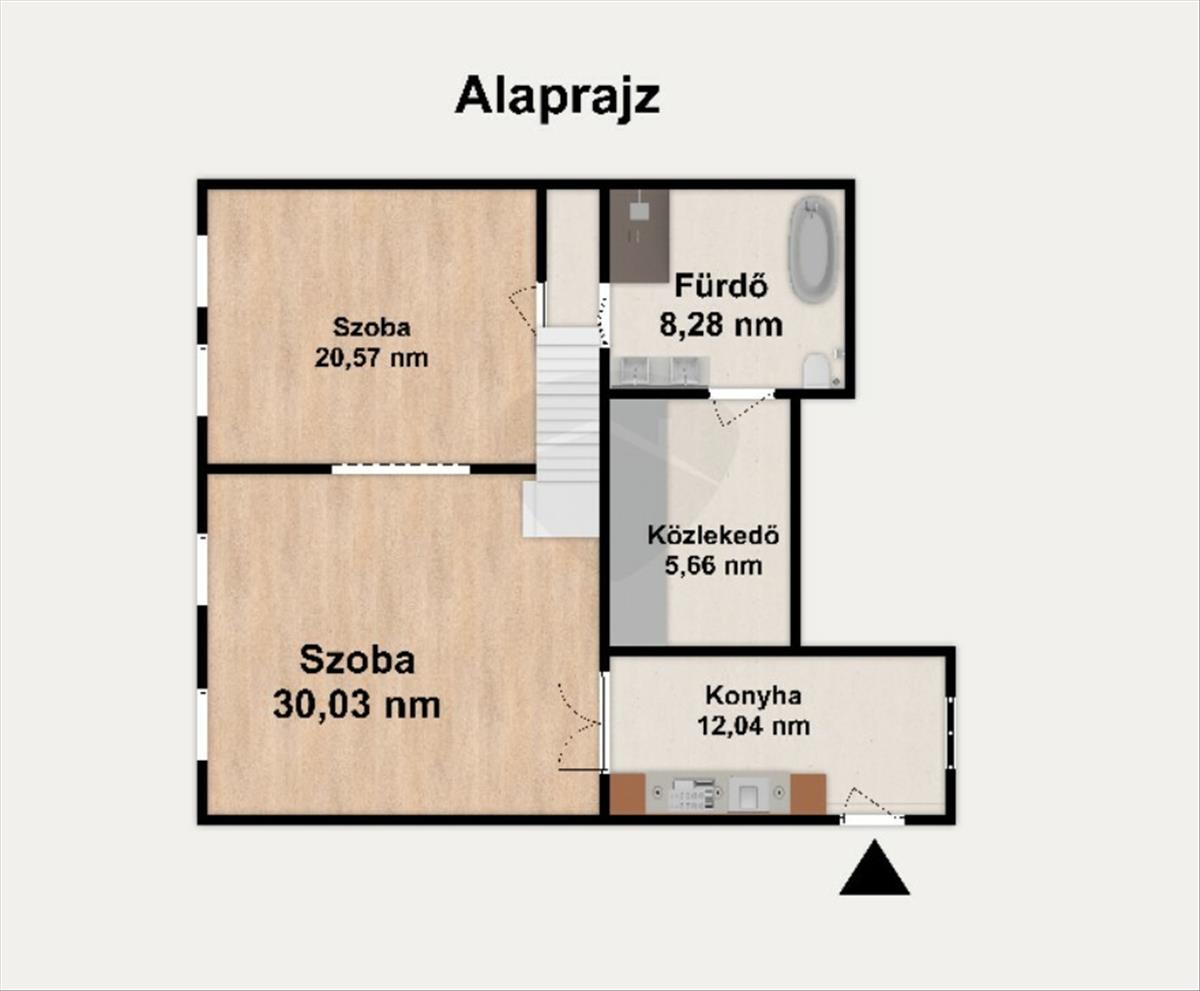 Az alsó szinten a fürdő, konyha, közlekedő: 2, 49 m
