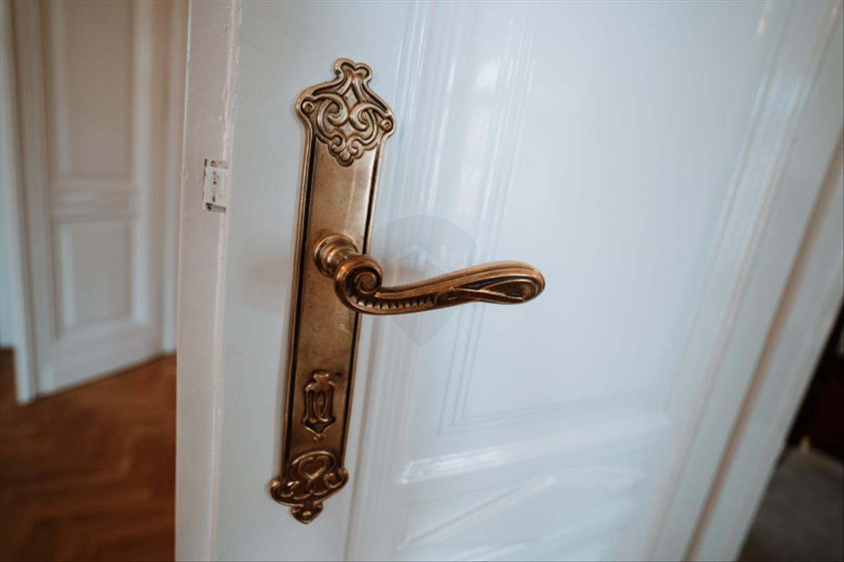 Megőrzött, felújított antik rézkilincsek, eredeti beltéri nyílászárók