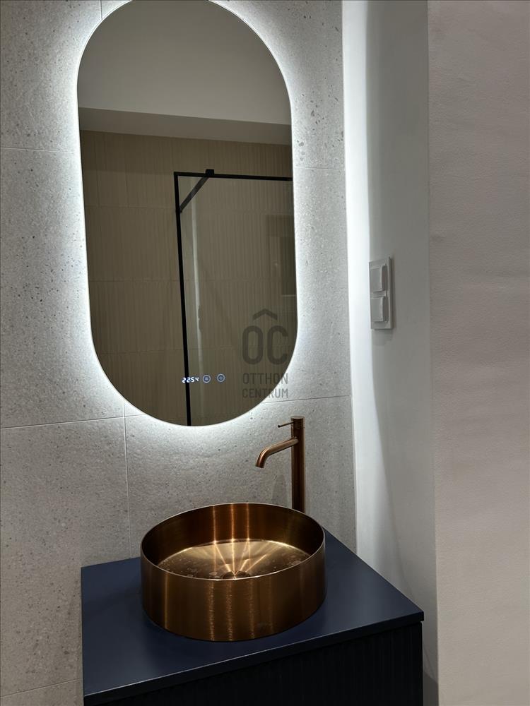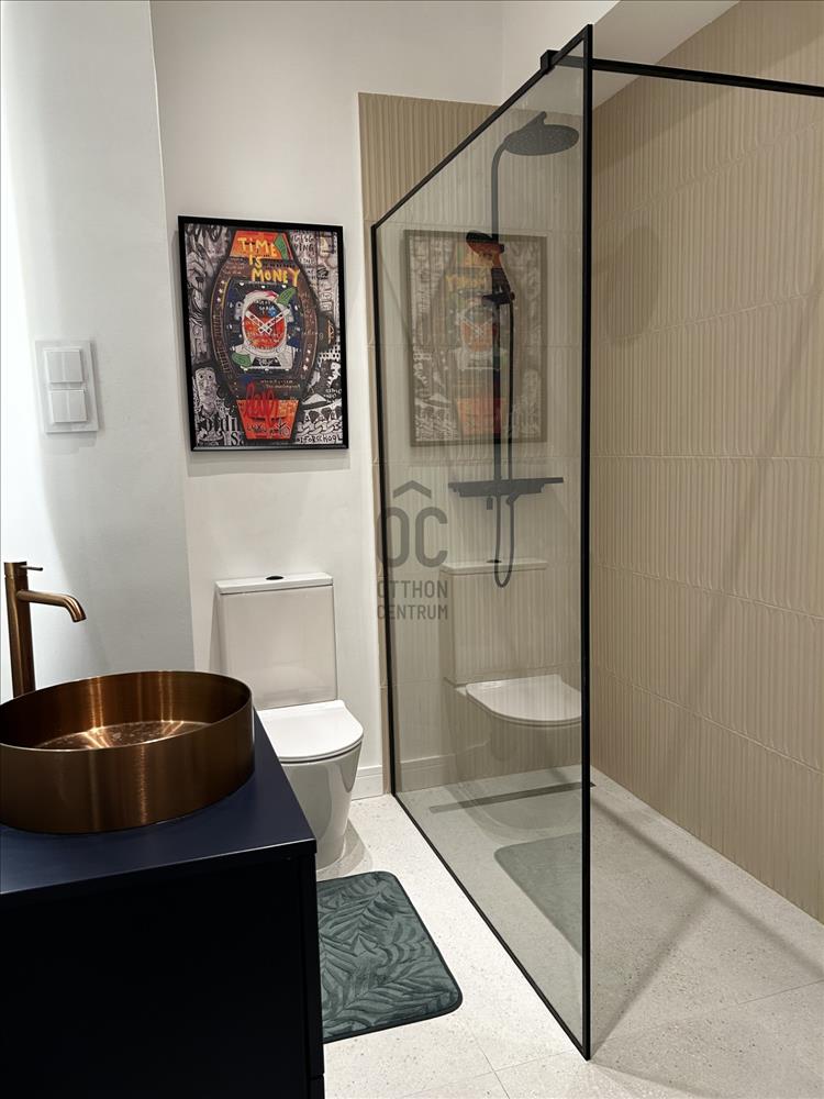 A fürdőszoba prémium megjelenésű, walk-in zuhanyzóval, egyedi mosdóval és magas minőségű burkolatokkal készült.