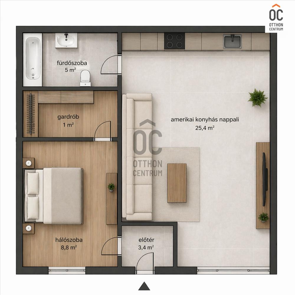 A 40 m²-es ingatlan átgondolt kialakításának és belsőépítészeti megoldásainak köszönhetően modern, letisztult és otthonos életteret kínál. a világos amerikai konyhás nappalit egyedileg kialakított hangulatvilágítás és beépített elektromos kandalló teszi különlegessé, míg a külön nyíló hálószoba kényelmes elvonulást biztosít.