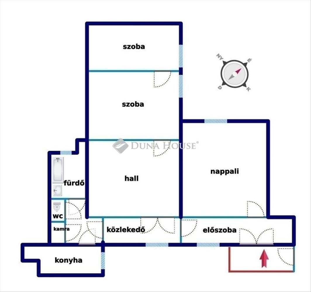 Jelenlegi elrendezés: 3 szoba + hall, de könnyen kialakítható 4 szoba + nappali–konyha–étkező