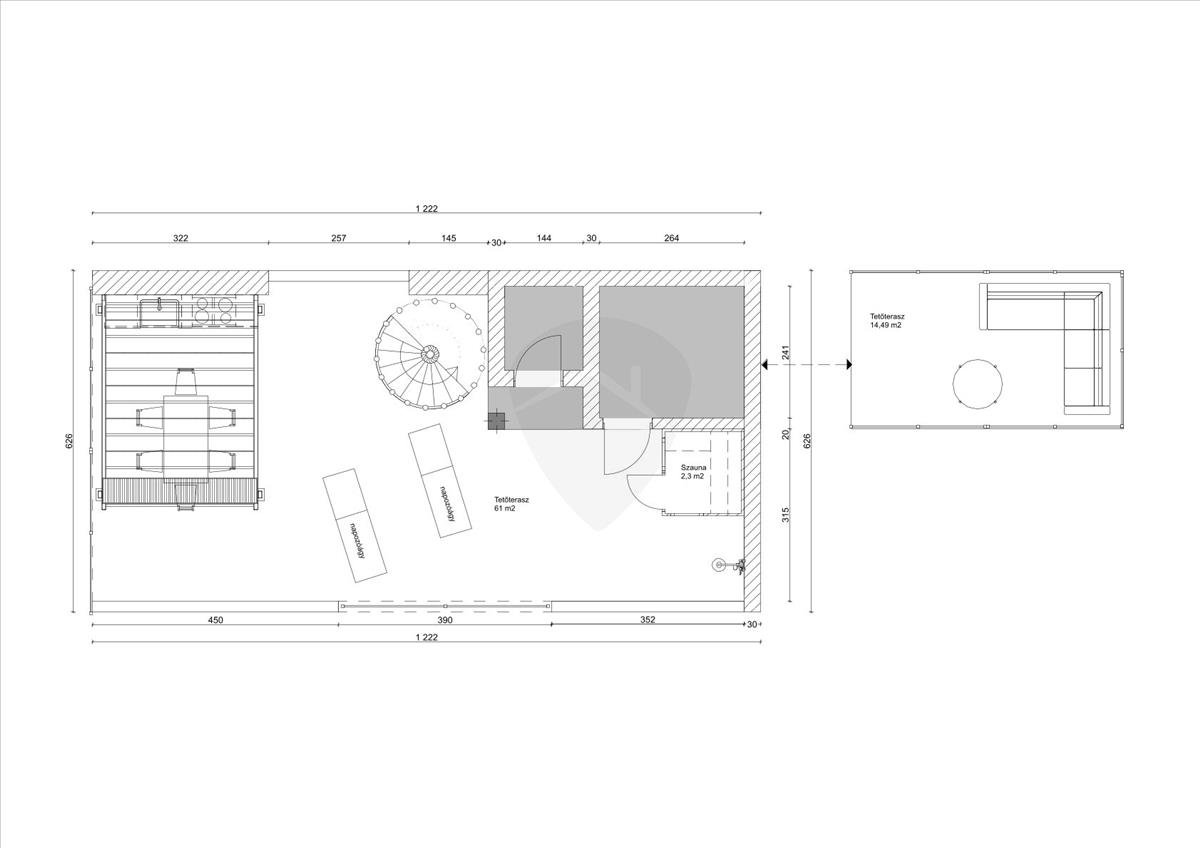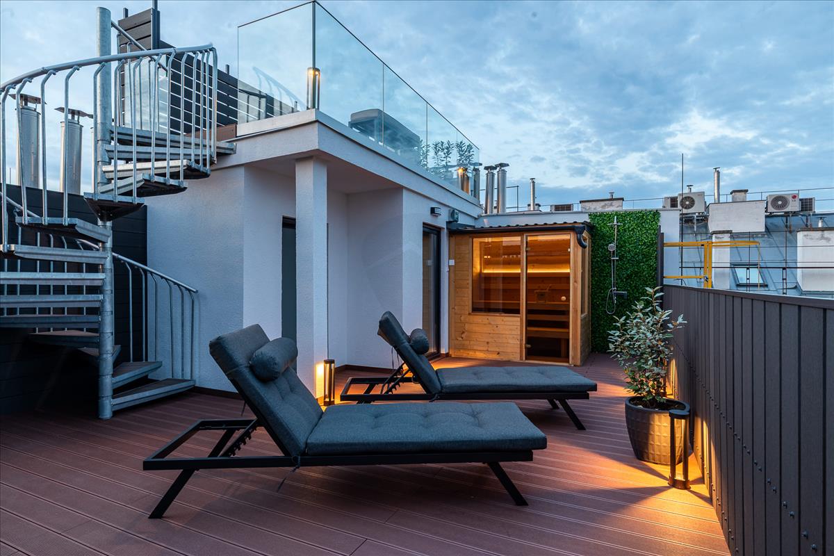 - 65 Nm intim/ privát tetőterasz szaunával, beépített grill konyhával és tároló helyiséggel
