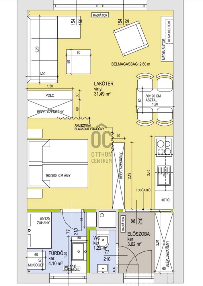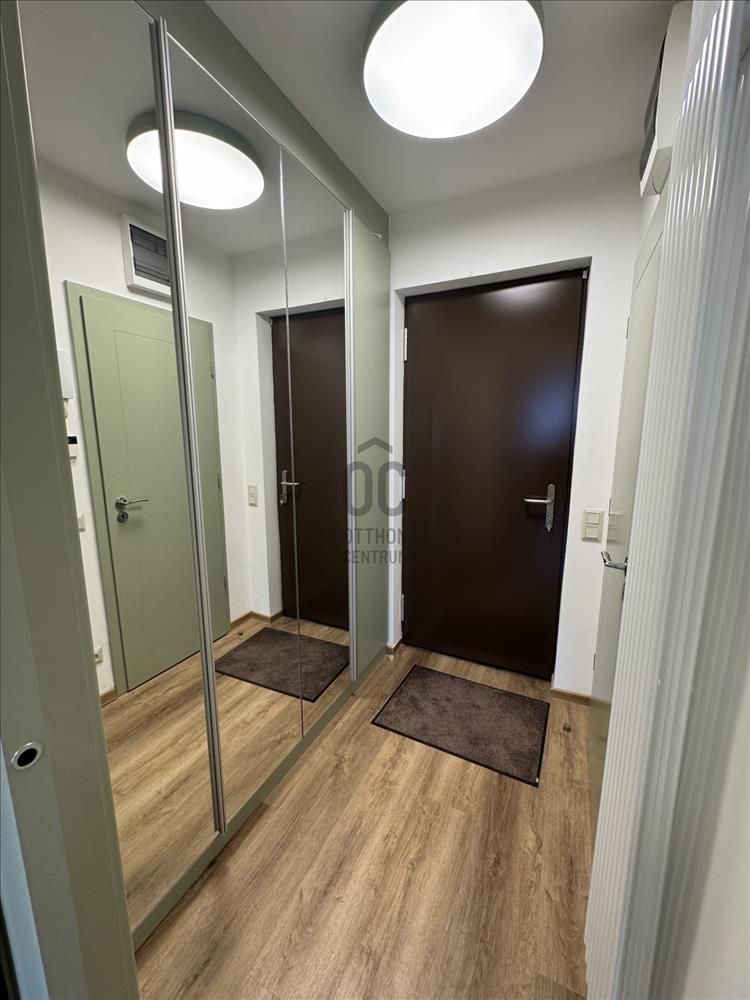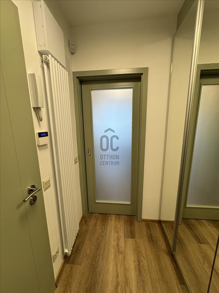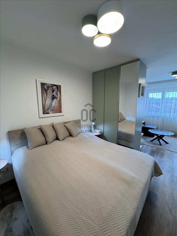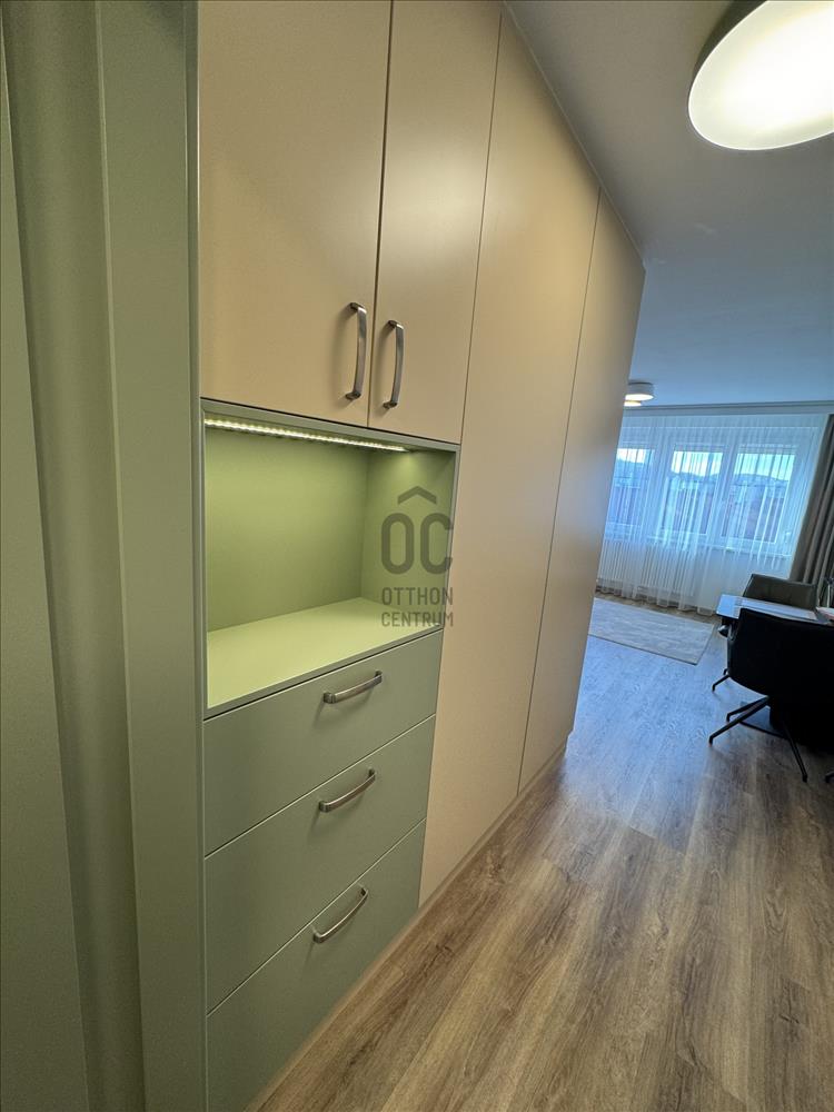 Az előszobába lépve hatalmas tükrös gardrob fogad, ami nemcsak befogad minden kabátot és cipőt, hanem tágas térérzetet ad mindjárt a megérkezéskor. Balra a mosdó aminek hangulatos design csempéje üde színeket ad a helyiségnek. Szemben tovább haladva a gépesített konyhába érkezünk, amely az egész lakás egyedileg gyártott bútoraihoz hasonlóan törtfehér és finom zöld színekben lett kialakítva. a lakás tulajdonképpen egyterű, de a belsőépítész által tervezett bútorok körbehatárolják a konyhát, illetve egy hálószobát, ahol a hatalmas, 180 cm széles kényelmes ágy kapott helyet. a hálóból nyílik a zuhanyzós és ablakos fürdőszoba, ahol mosó-szárítógép is helyet kapott, melynek segítségével nem kell a lakásban ruhaszárítót kerülgetni. Aki már lakott kis lakásban, tudja milyen fontos ez.