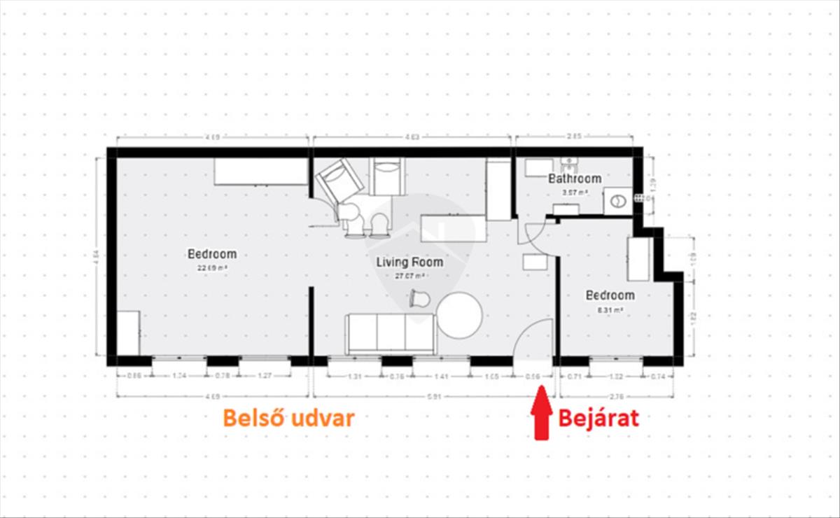 Az ingatlan alapterülete 63 négyzetméter, amely 2 tágas szobát és egy félszobát tartalmaz, így lehetőséget biztosít a kényelmes élettér kialakítására.