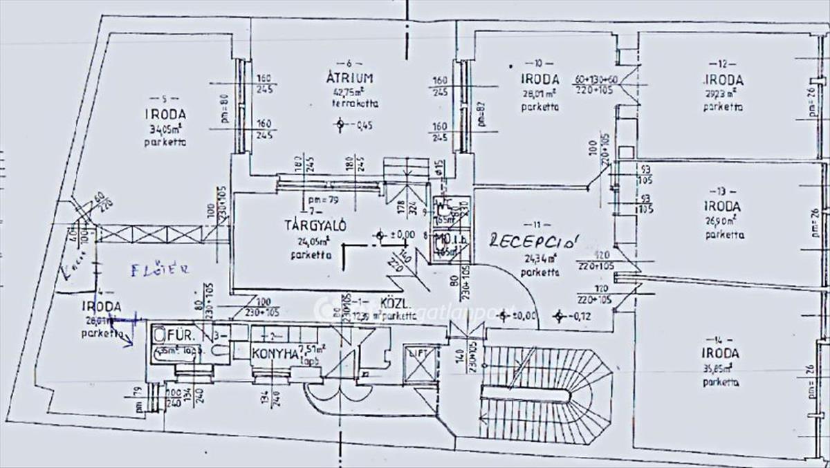 Főbb jellemzők: Alapterület: 300 nm, 6 irodahelyiség, 2 tárgyaló, konyha, fürdőszoba, vendég mosdó, tárolók. Belmagasság: 3, 8 méter. Panorámaablakok a teljes utcafronton, kilátással a Szervita térre. Fedett belső átriumos kialakítás. Lift az épületben. Jó műszaki állapot.
