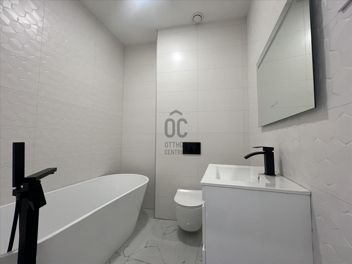 Egyik fürdőszobája kádas, a másik zuhanyzós, az előszobában kialakítottak egy vendég wc-t. a közlekedő végén praktikus háztartási helyiség kapott helyet, melyből akár mosókonyha is kialakítható.