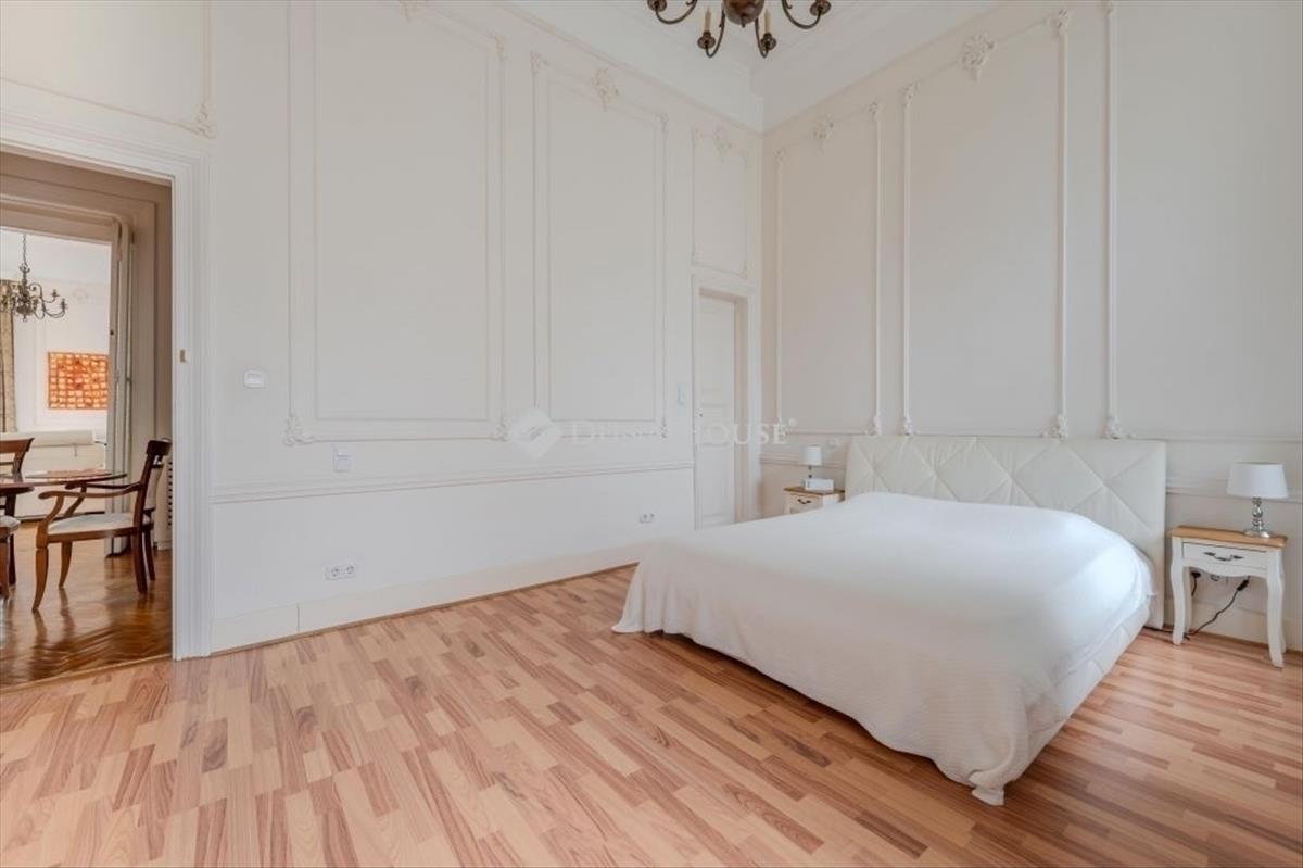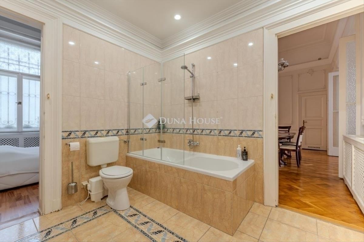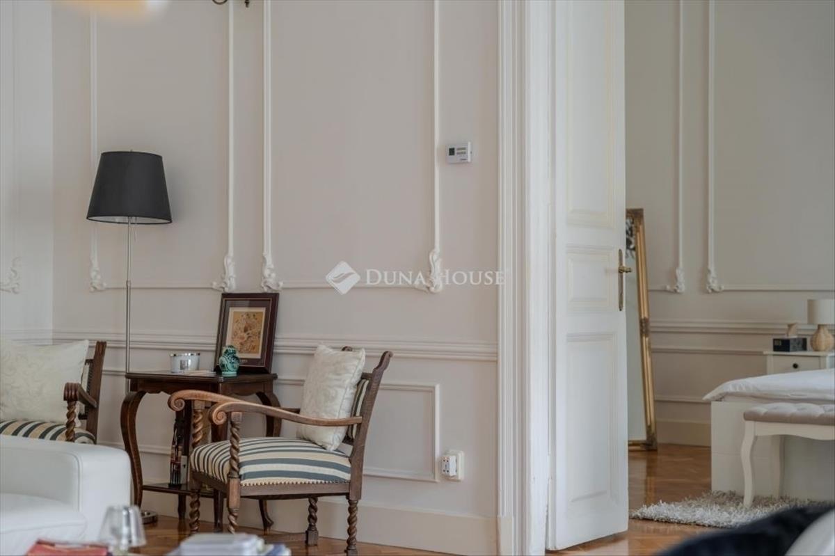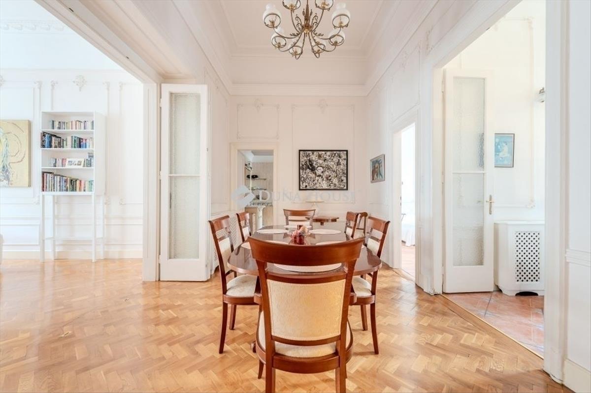 A második emeleten lévő lakás kiváló elosztású: tágas előtér, nagy étkező harmonikaajtóval a nappaliba, két hálószoba, két fürdőszoba és 3 wc biztosítja a kényelmet. a hatalmas belmagasság, a klasszikus stukkódíszítés, az eredeti történelmi fa nyílászárók, spaletták, és a világos, utcai ablakok egyedülálló nagypolgári hangulatot teremtenek. a fűtés gáz cirkó. Riasztó, és légkondicionáló van.